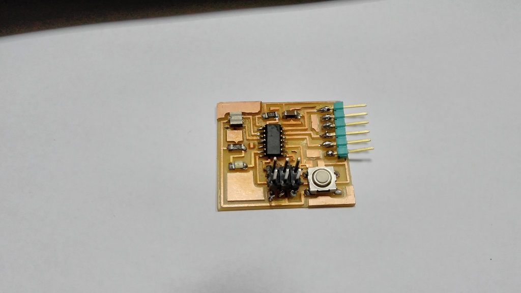 The first one was a test, whose milling went on very well right until I sent the interior image. Turns out my interior design was off by 1.5mm towards the right of the x-axis and 1.5mm off on the y-axis. It ended up cutting inside my nicely milled circuit and chipping off some of the copper traces.