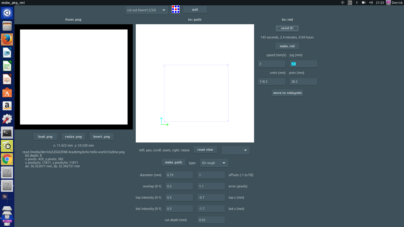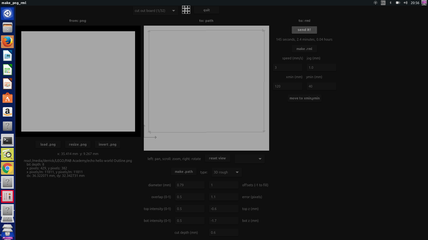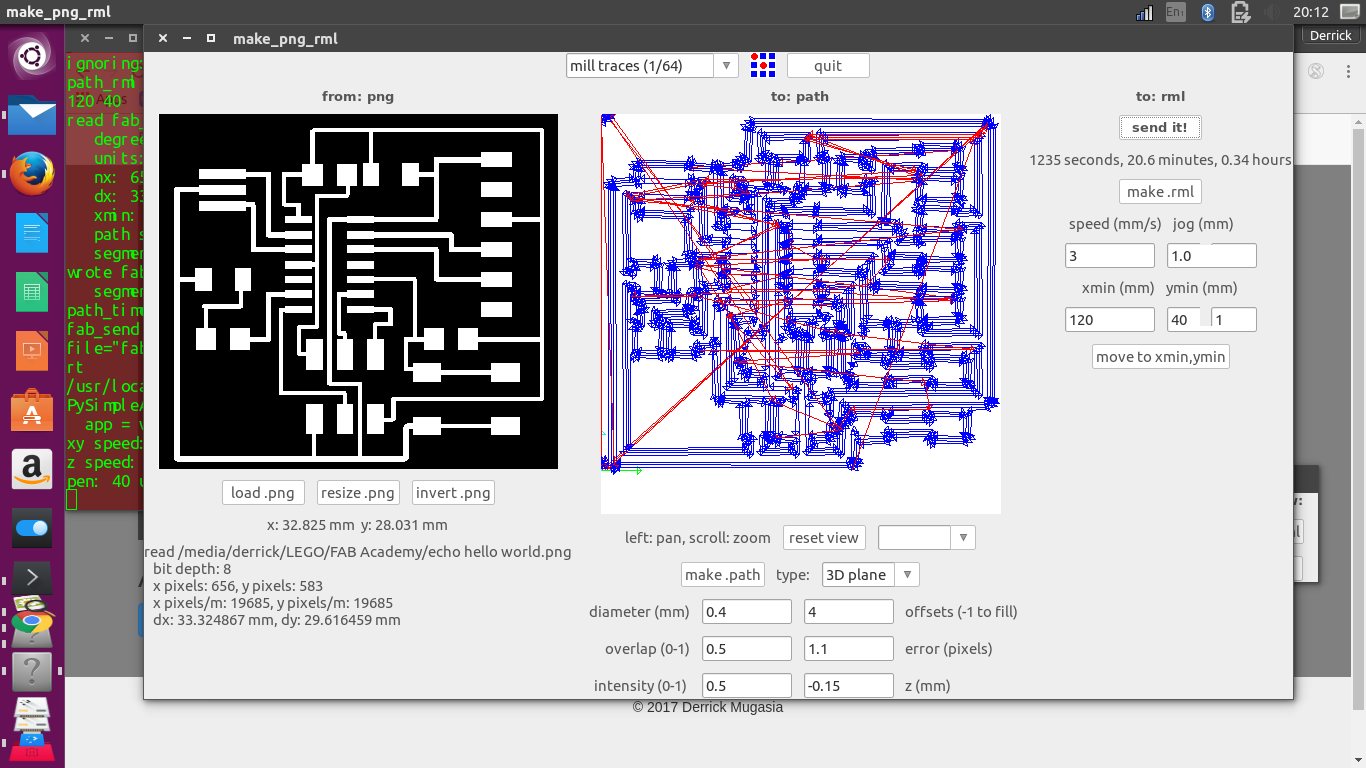 At this point I was ready for milling. I powered the Modela and set the xmin and ymin at 120mm and 40mm respectively, as that is generaly where my small piece of pcb board was located. I also set the Z-axis at value -0.15 and used a 1/64" bit for the job