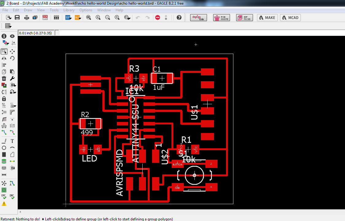 After this I had to confirm and make sure that the design has no errors. Towards the bottom left of the tools panel there is a tool called RATNEST. I clicked on Ratnest and the response I got was 'Nothing to do!'. I as pleased because then I knew that all the tracks had been completely routed.
