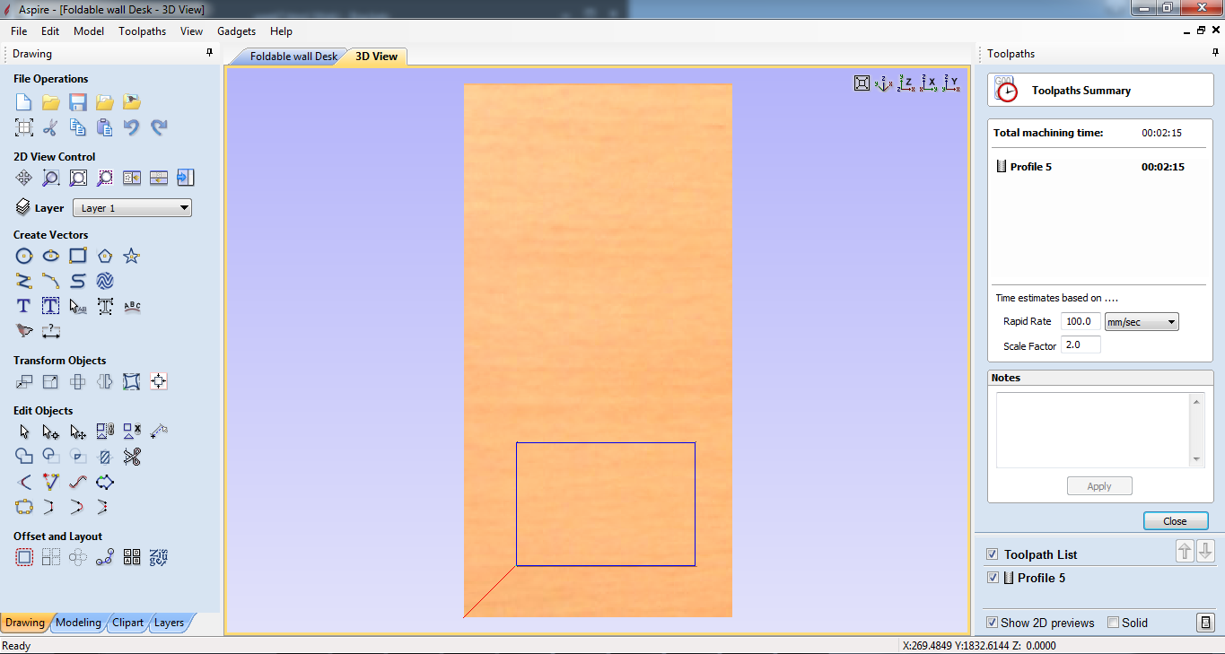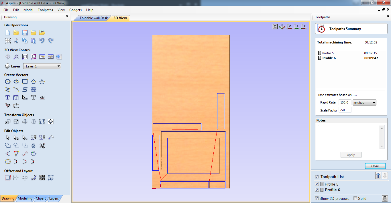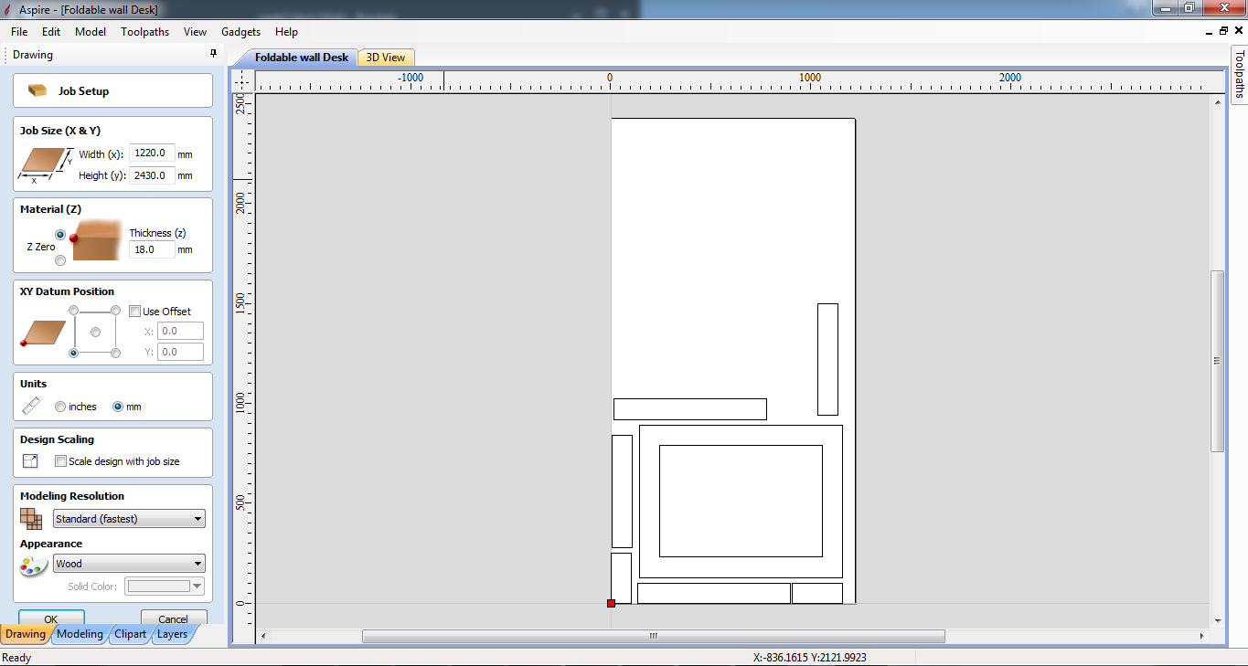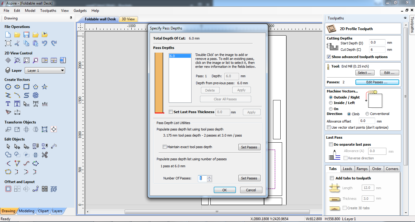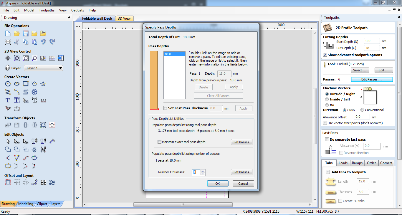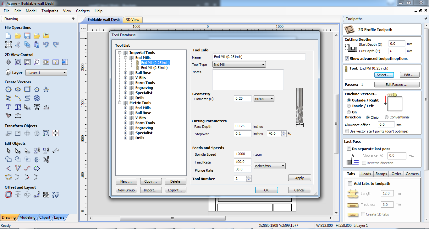 I simulated and calculated my toolpaths using Aspire.I did this by first exporting my design from corel draw in pdf format and importing it to Aspire. I specied te machine ize and material thickness