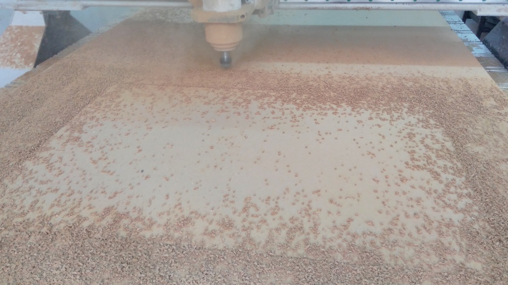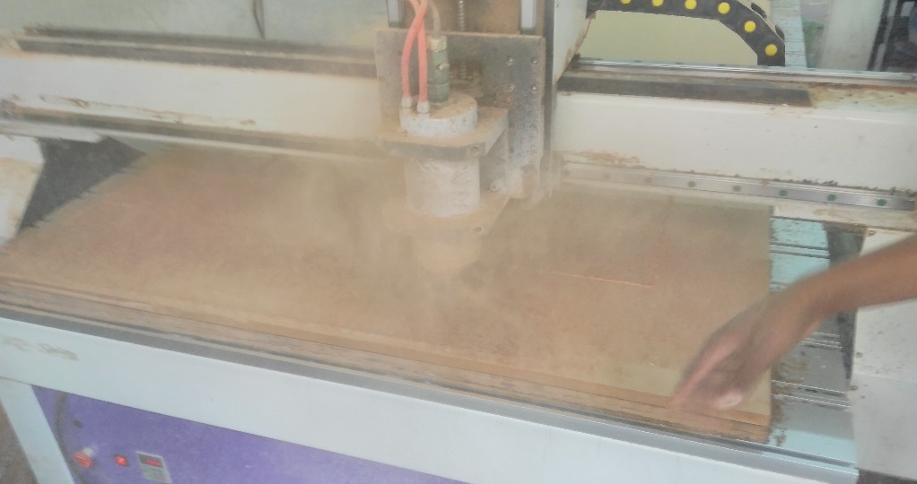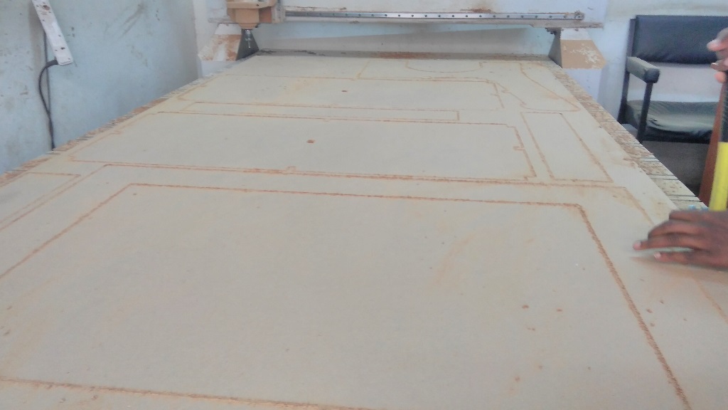 Then I placed a fresh 8ft by 4ft material on the machine's bed and made sure that the orientation is well balanced. I then nailed the board on the sacrificial to ensure that it does not move at all during the cutting process.