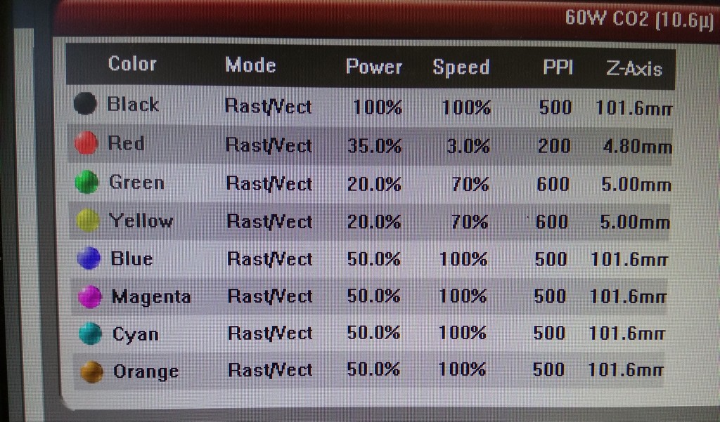 No different for this study of kerf, I began with the cutting parameter file for 5mm thick plywood but reduced the plywood thickness to z= 4.8mm, power to 35% instead of 40%, varied the speed to 4% instead of 3% and keeping the PPI at 200pps.