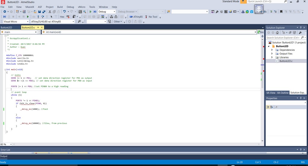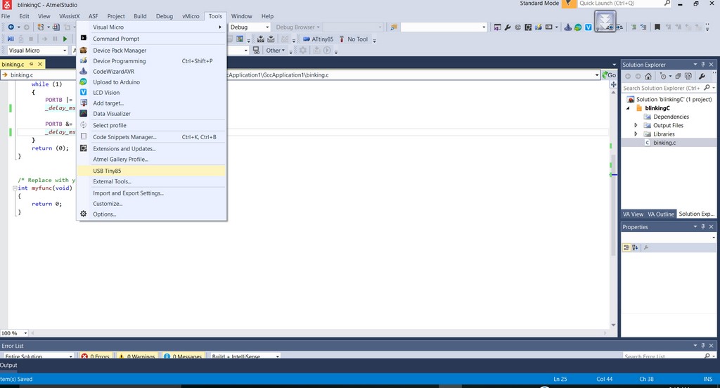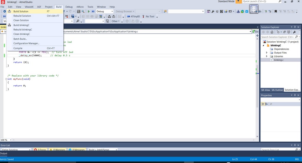 ------ Build started: Project: blinkingC, Configuration: Debug AVR ------ Build started. Project "blinkingC.cproj" (default targets): Target "PreBuildEvent" skipped, due to false condition; ('$(PreBuildEvent)'!='') was evaluated as (''!=''). Target "CoreBuild" in file "C:\Program Files (x86)\Atmel\Studio\7.0\Vs\Compiler.targets" from project "C:\Users\Guan\Documents\Atmel Studio\7.0\GccApplication1\GccApplication1\blinkingC.cproj" (target "Build" depends on it): Using "RunCompilerTask" task from assembly "C:\Program Files (x86)\Atmel\Studio\7.0\Extensions\Application\AvrGCC.dll". Task "RunCompilerTask" Shell Utils Path C:\Program Files (x86)\Atmel\Studio\7.0\shellUtils C:\Program Files (x86)\Atmel\Studio\7.0\shellUtils\make.exe all --jobs 8 --output-sync Building file: .././binking.c Invoking: AVR/GNU C Compiler : 5.4.0 "C:\Program Files (x86)\Atmel\Studio\7.0\toolchain\avr8\avr8-gnu-toolchain\bin\avr-gcc.exe" -x c -funsigned-char -funsigned-bitfields -DDEBUG -I"C:\Program Files (x86)\Atmel\Studio\7.0\Packs\atmel\ATtiny_DFP\1.2.118\include" -O1 -ffunction-sections -fdata-sections -fpack-struct -fshort-enums -g2 -Wall -mmcu=attiny85 -B "C:\Program Files (x86)\Atmel\Studio\7.0\Packs\atmel\ATtiny_DFP\1.2.118\gcc\dev\attiny85" -c -std=gnu99 -MD -MP -MF "binking.d" -MT"binking.d" -MT"binking.o" -o "binking.o" ".././binking.c" Finished building: .././binking.c Building target: blinkingC.elf Invoking: AVR/GNU Linker : 5.4.0 "C:\Program Files (x86)\Atmel\Studio\7.0\toolchain\avr8\avr8-gnu-toolchain\bin\avr-gcc.exe" -o blinkingC.elf binking.o -Wl,-Map="blinkingC.map" -Wl,--start-group -Wl,-lm -Wl,--end-group -Wl,--gc-sections -mmcu=attiny85 -B "C:\Program Files (x86)\Atmel\Studio\7.0\Packs\atmel\ATtiny_DFP\1.2.118\gcc\dev\attiny85" Finished building target: blinkingC.elf "C:\Program Files (x86)\Atmel\Studio\7.0\toolchain\avr8\avr8-gnu-toolchain\bin\avr-objcopy.exe" -O ihex -R .eeprom -R .fuse -R .lock -R .signature -R .user_signatures "blinkingC.elf" "blinkingC.hex" "C:\Program Files (x86)\Atmel\Studio\7.0\toolchain\avr8\avr8-gnu-toolchain\bin\avr-objcopy.exe" -j .eeprom --set-section-flags=.eeprom=alloc,load --change-section-lma .eeprom=0 --no-change-warnings -O ihex "blinkingC.elf" "blinkingC.eep" || exit 0 "C:\Program Files (x86)\Atmel\Studio\7.0\toolchain\avr8\avr8-gnu-toolchain\bin\avr-objdump.exe" -h -S "blinkingC.elf" > "blinkingC.lss" "C:\Program Files (x86)\Atmel\Studio\7.0\toolchain\avr8\avr8-gnu-toolchain\bin\avr-objcopy.exe" -O srec -R .eeprom -R .fuse -R .lock -R .signature -R .user_signatures "blinkingC.elf" "blinkingC.srec" "C:\Program Files (x86)\Atmel\Studio\7.0\toolchain\avr8\avr8-gnu-toolchain\bin\avr-size.exe" "blinkingC.elf" text data bss dec hex filename 96 0 0 96 60 blinkingC.elf Done executing task "RunCompilerTask". Using "RunOutputFileVerifyTask" task from assembly "C:\Program Files (x86)\Atmel\Studio\7.0\Extensions\Application\AvrGCC.dll". Task "RunOutputFileVerifyTask" Program Memory Usage : 96 bytes 1.2 % Full Data Memory Usage : 0 bytes 0.0 % Full Done executing task "RunOutputFileVerifyTask". Done building target "CoreBuild" in project "blinkingC.cproj". Target "PostBuildEvent" skipped, due to false condition; ('$(PostBuildEvent)' != '') was evaluated as ('' != ''). Target "Build" in file "C:\Program Files (x86)\Atmel\Studio\7.0\Vs\Avr.common.targets" from project "C:\Users\Guan\Documents\Atmel Studio\7.0\GccApplication1\GccApplication1\blinkingC.cproj" (entry point): Done building target "Build" in project "blinkingC.cproj". Done building project "blinkingC.cproj". Build succeeded. ========== Build: 1 succeeded or up-to-date, 0 failed, 0 skipped ==========