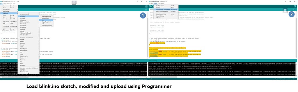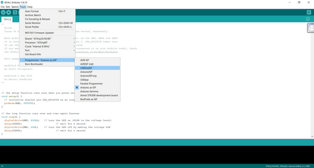 To start with, after burning the Bootloader, I proceed to loaded the blink.ino sketch from the examples within the Arduino IDE and did some modification of the programme to reflect on LED connected pin PB1 and proceed to upload the sketch using programmer as follow: