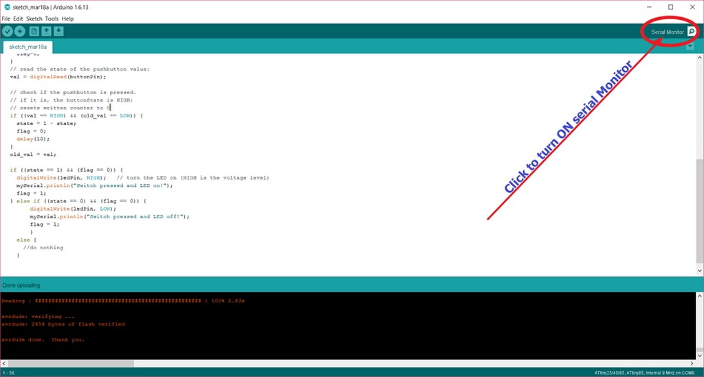 Similar display of switch and LED condition can also be achieved in serial monitor in Arduino IDE. Click at the top right hand corner in IDE as shown.