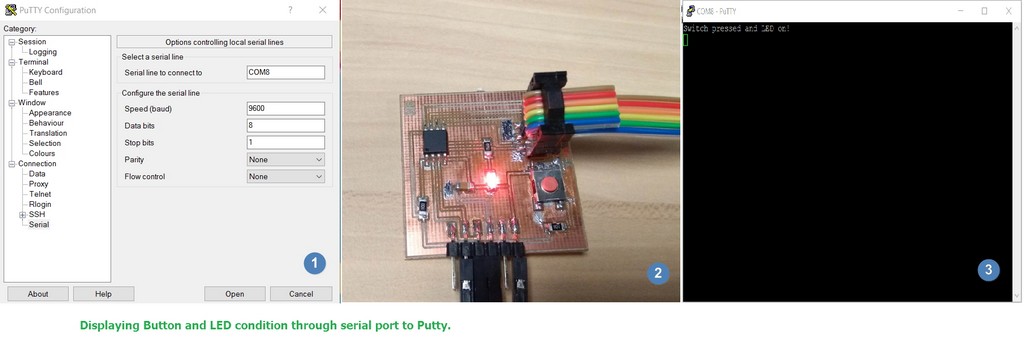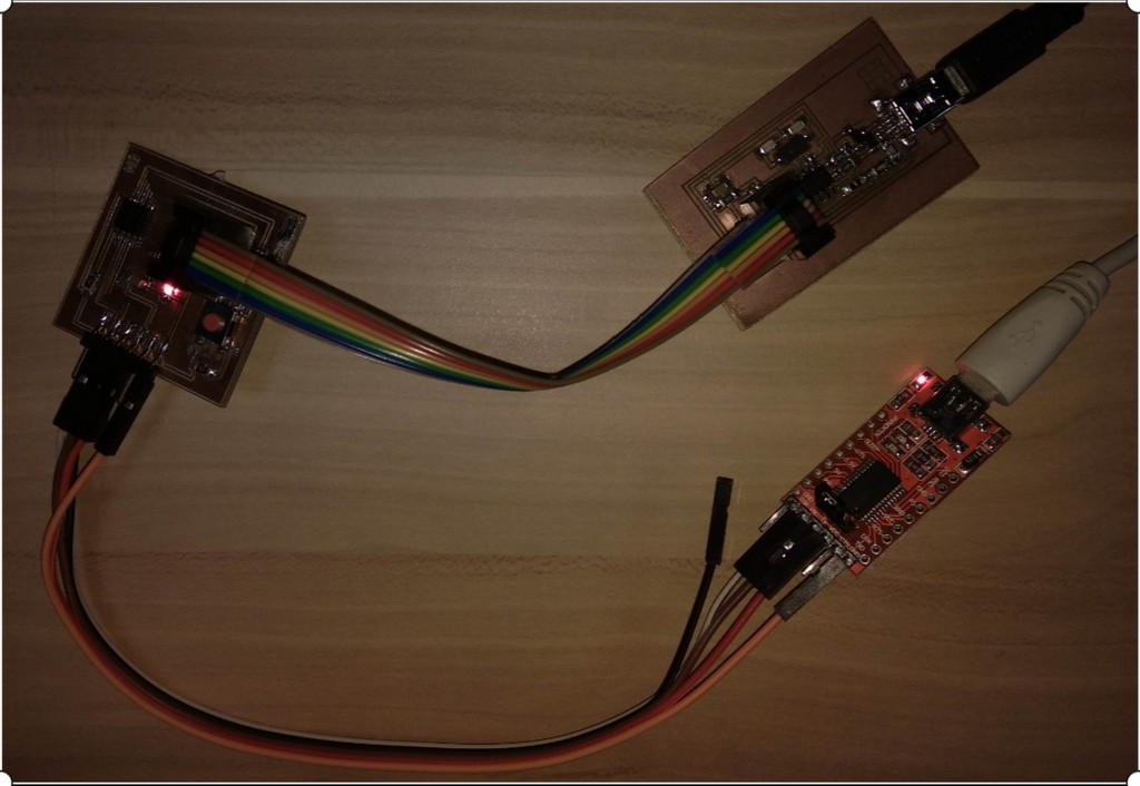 With the tests above, I can almost certain that my FabISP and Hello are almost completely functioning. Except one more area- Serial communication with computer through FTDI USB to TTL Serial coverter board. So next up I had connected the Hello board to FTDI USB to TTL Serial converter, and proceed with the testing in next section.