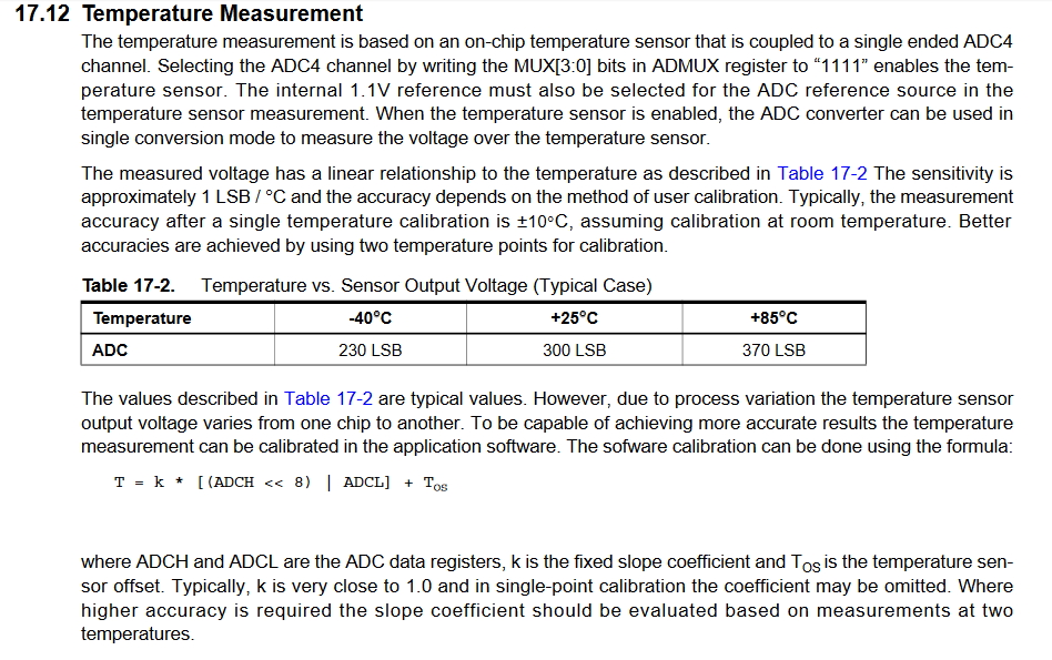 The on-chip temperature sensor is selected by writing the code “1111” to the MUX[3:0] bits in ADMUX register when the ADC4 channel is used as an ADC input.
