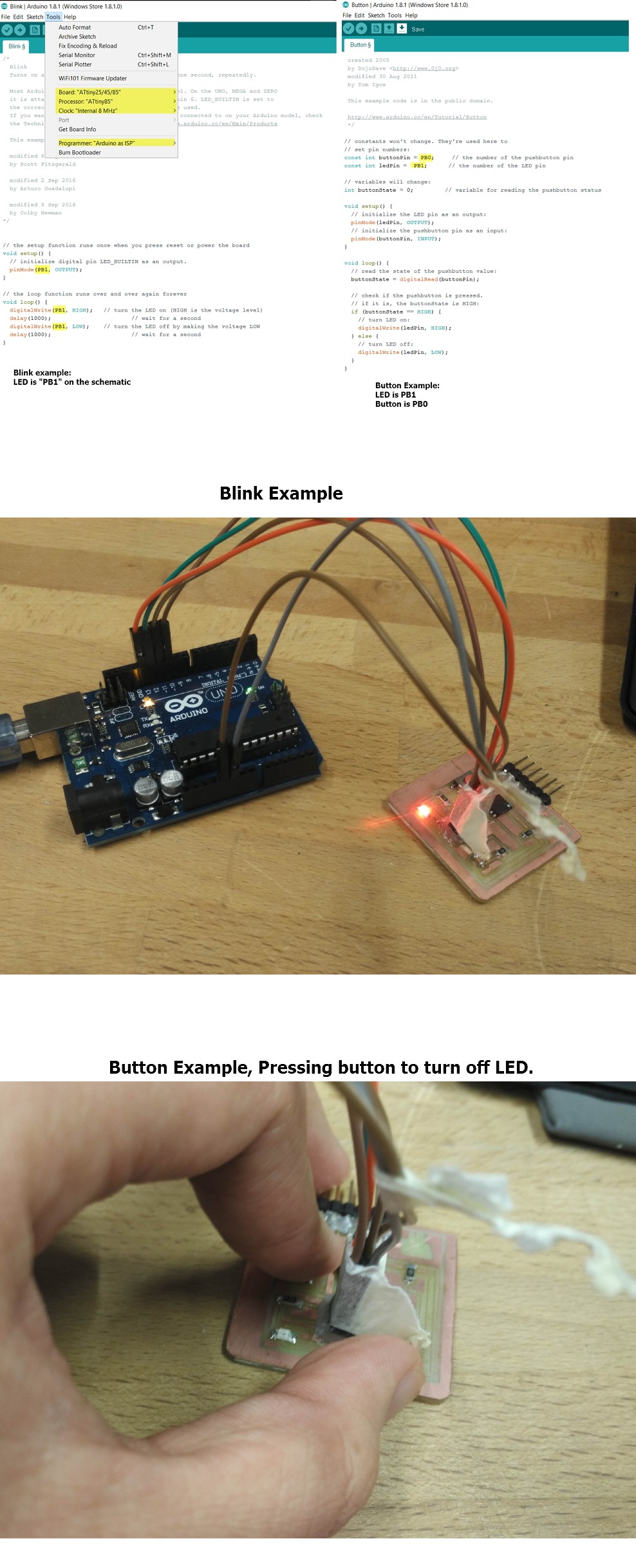 After connection, I used the Arduino IDE and open up the Example Code>Blink and change the LED to "PB1"