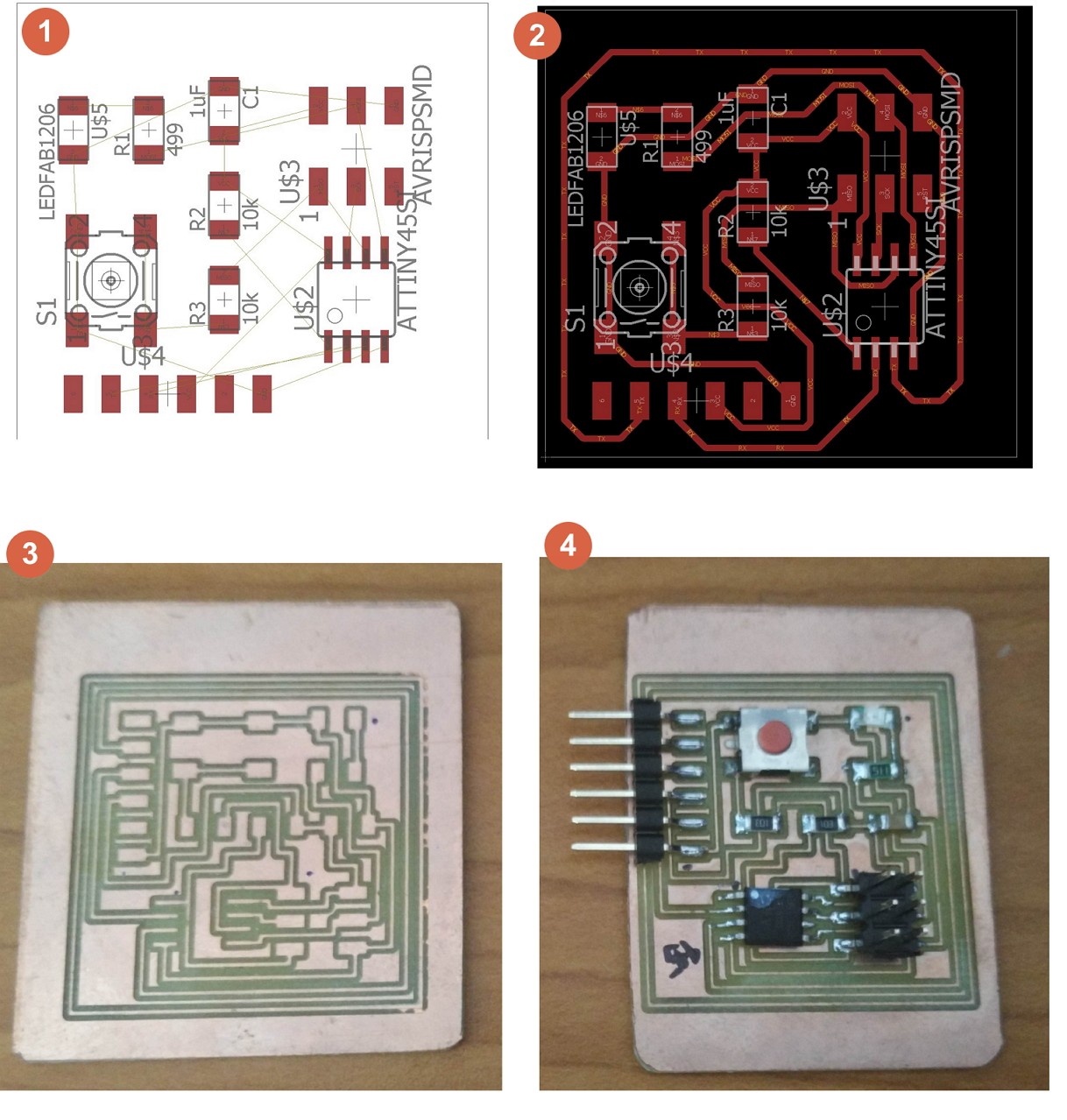 With some help from my course mate Jeff, I designed circuit in schematic, convert it in board, routing the tracks, milling it out and soldering the components into the circuit.