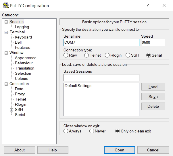 void loop() { if(mySerial.available() > 0){ state = mySerial.read(); flag=0; } // read the state of the pushbutton value: val = digitalRead(buttonPin); // check if the pushbutton is pressed. // if it is, the buttonState is HIGH: // resets written counter to 0 if ((val == HIGH) && (old_val == LOW)) { state = 1 - state; flag = 0; delay(10); } old_val = val; if ((state == 1) && (flag == 0)) { digitalWrite(ledPin, HIGH); // turn the LED on (HIGH is the voltage level) mySerial.println("led is on!"); flag = 1; } else if ((state == 0) && (flag == 0)) { digitalWrite(ledPin, LOW); mySerial.println("led is off!"); flag = 1; } else { //do nothing } }3) In PuTTY, we set it as Serial communication, for my example, my FDTI board is in COM7, make sure the Speed is set to 9600