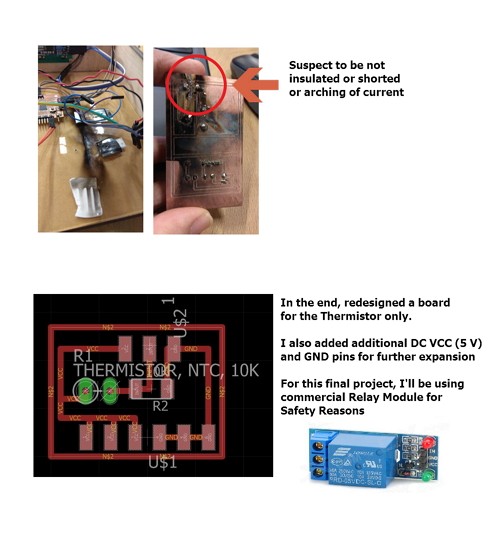1) While working on the relay board and testing it, my board got shorted and destroyed it entirely. With the fear of safety, I seeked adviced from my dad and learned that my board may not be well insulated and may be connected wrongly. Therefore I created a new board for my thermistor and using a Commercial board for the relay.