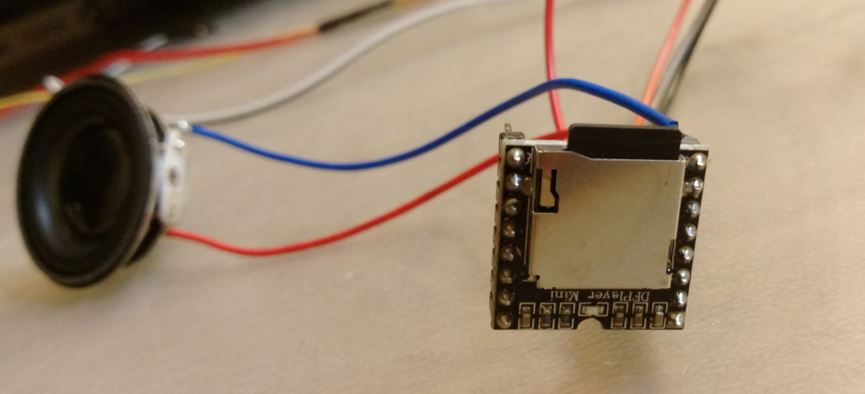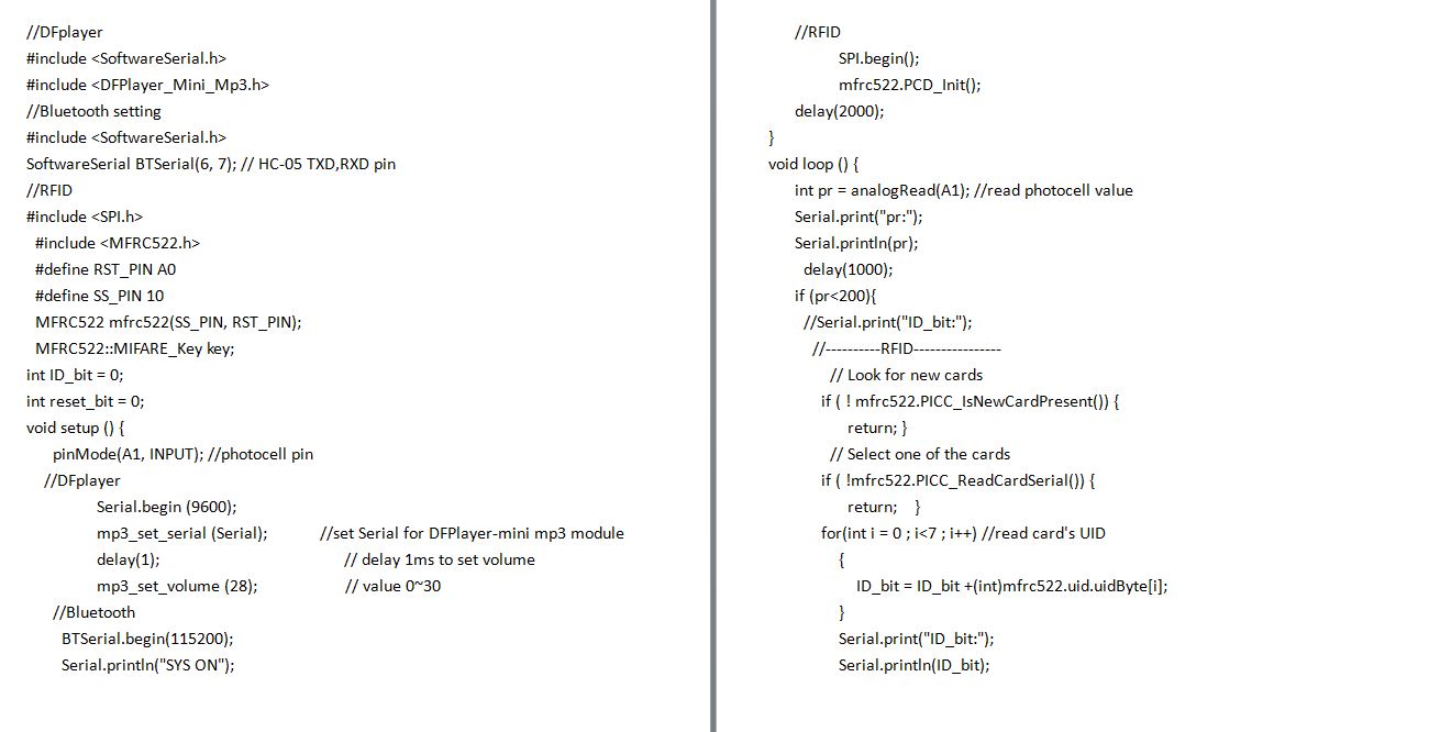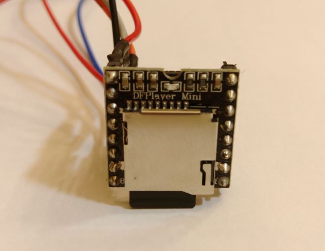 DFPlayer is the module which can play the music via plugin the micro sd card. I use this module and speaker as the output device. When the RFID RC-522 detects Eye or Ship's NFC tag, it will send the message to the main board, and the main board will send a command to the DFPlayer to play the relatived music from micro sd card.