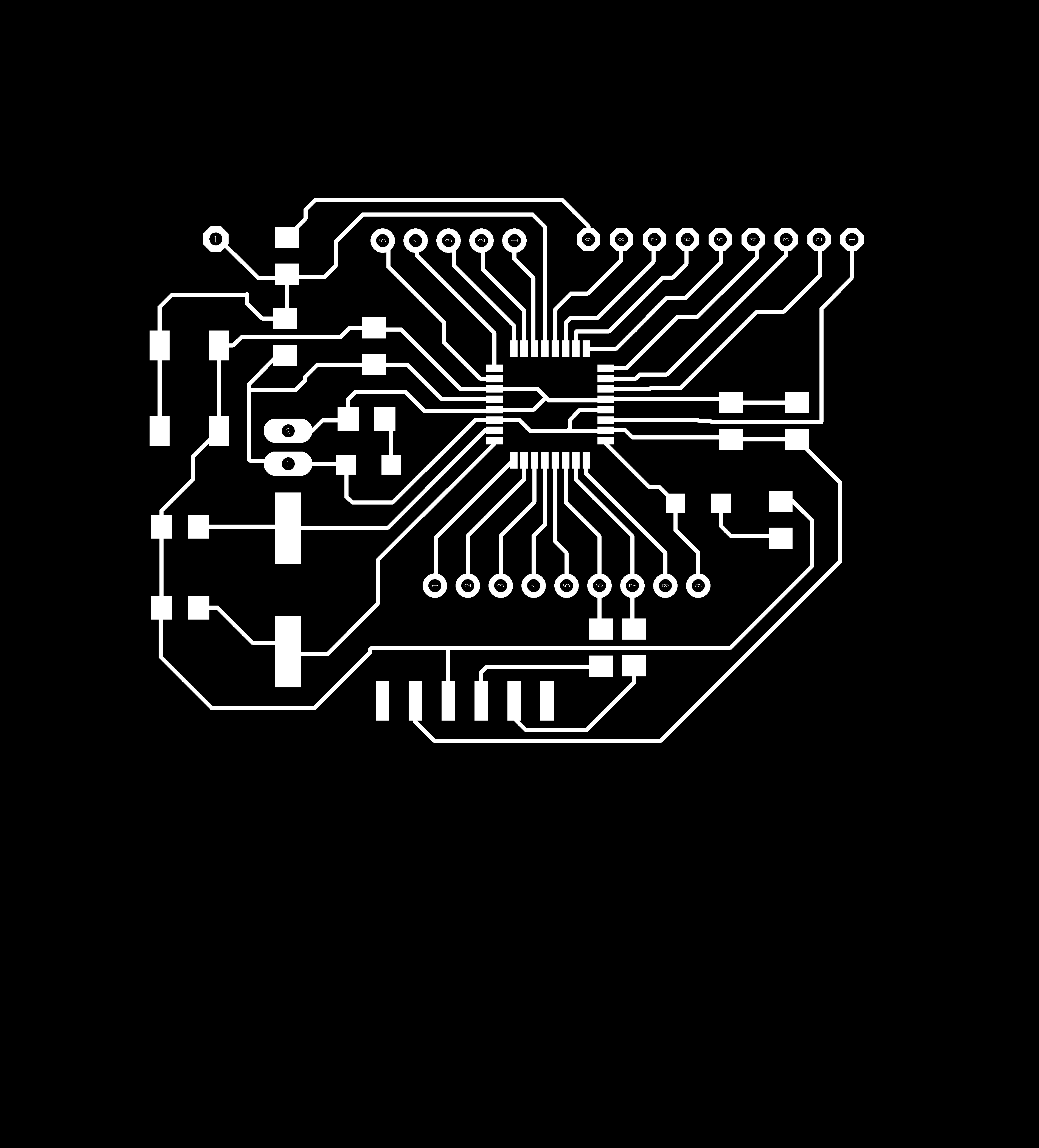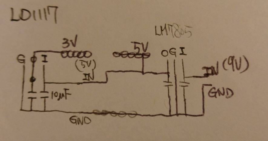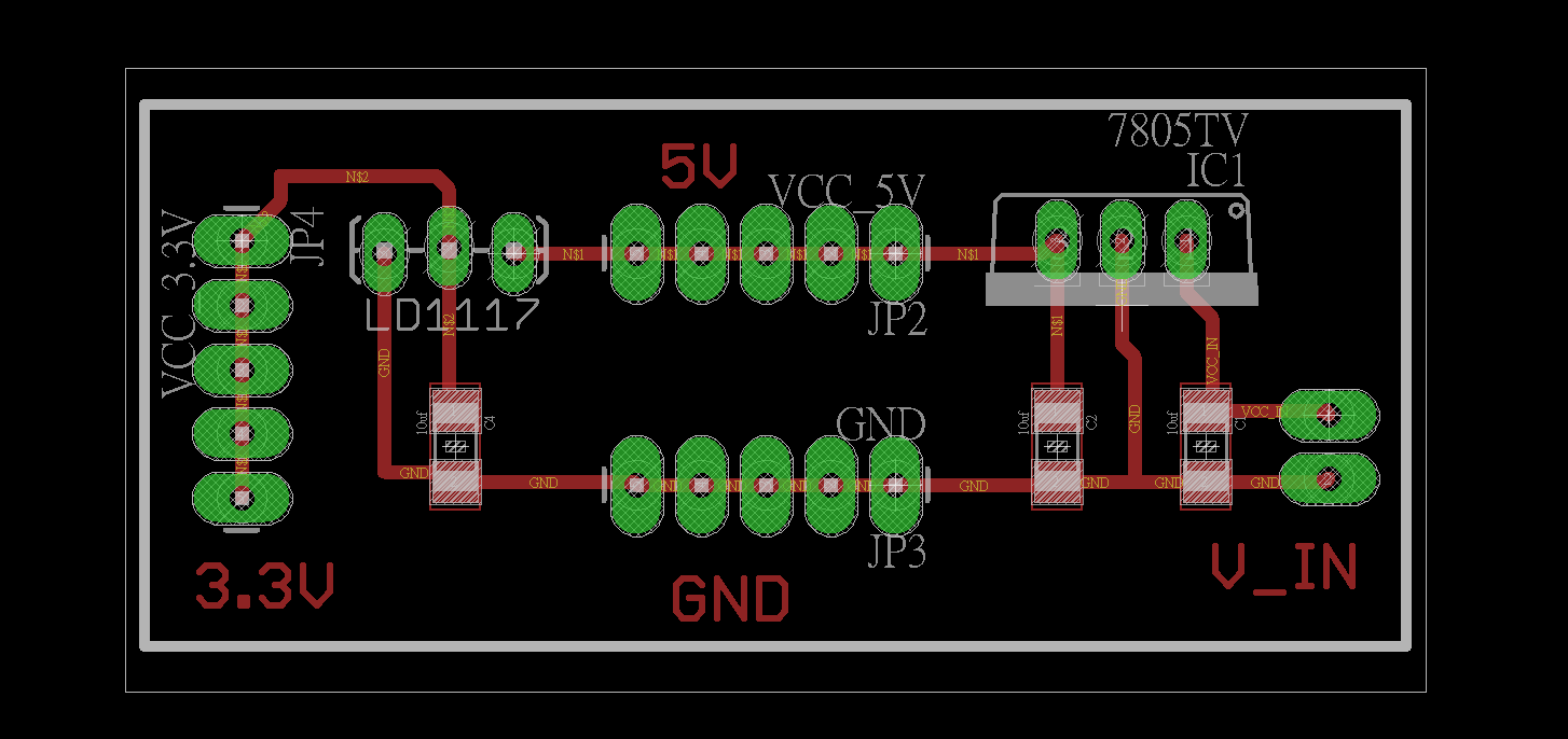 My power supply is 9V, and I use LM7085 to drop the power to 5V, and LD1117 to drop the power to 3.3V. After reading the datasheets about LM7805 and LD1117, I try to draw the circuits of the power supply and use conductive tapes to build circuit board rapidly for testing. After the test is successful, I draw the circuit with Eagle and milling it with Roland Modela MDX-20.