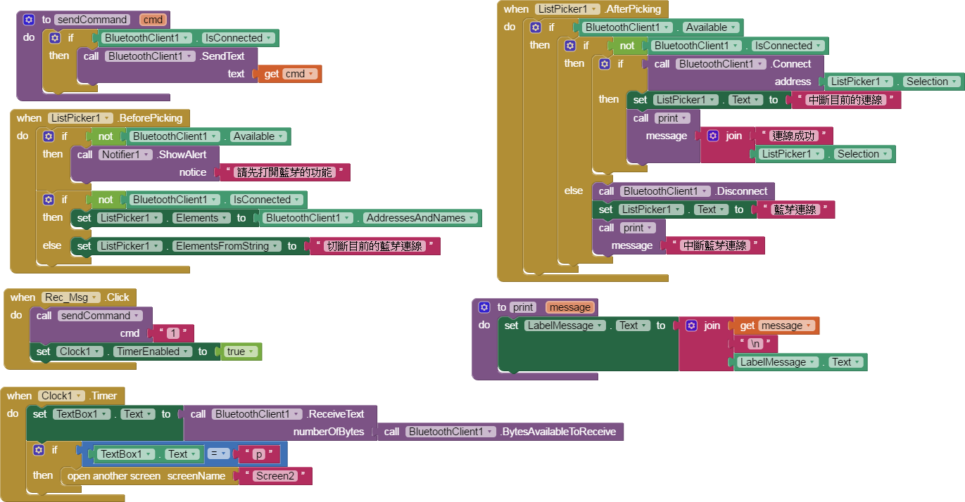 I use App Inventor to write an GUI to receive the message from main board and display the video, the app blocks and interface are as follow :