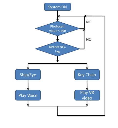 I use Bluetooth HC-05 module to communicate with cellphone which located at the VR glasses. When Key chain put on the culture box, RFID module will detects the its NFC tag and send message to the main board. Then main board will send command to the cellphone via bluetooth to display an VR video. The connection is as follow: