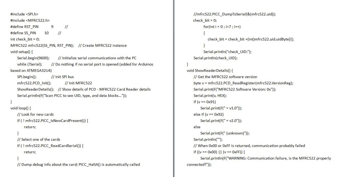 I wrote a program to check sum the UID of each NFC tag. I use adduino UNO as the main board and connect with RFID module, and the received UID will show on serial monitor. The c codes are show as follow :