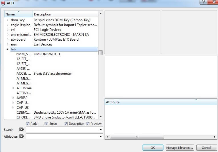 Active the program “Eagle” and design a Schematic. Then, Click on the "Add" option where you find the "fab" library