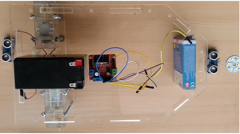 Making the forward, back and avoid movements here, the ultrasonic sensors work to avoid collision with an object and then advance after 5 seconds, make a right and left turn, then it can also be used in case of blackouts like Flashlight That's why the LEDs are on the top and the other on the front of the car.