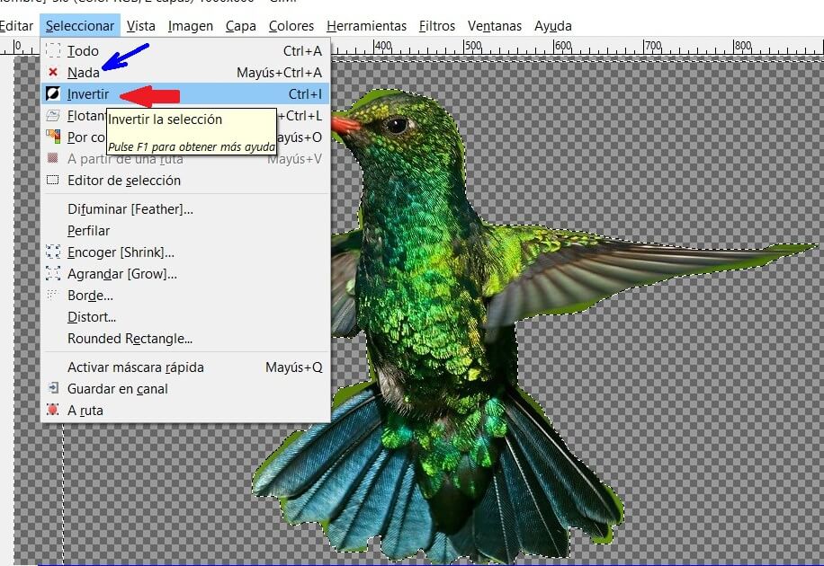 If you have deleted the background you can place the bird on another background. Now you can use the toolbar, tool select, and Nothing. And if you want to delete the external part use the select tool and the command Invert. Again use Delete key.