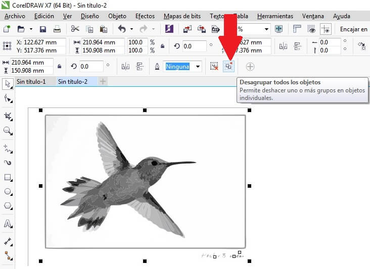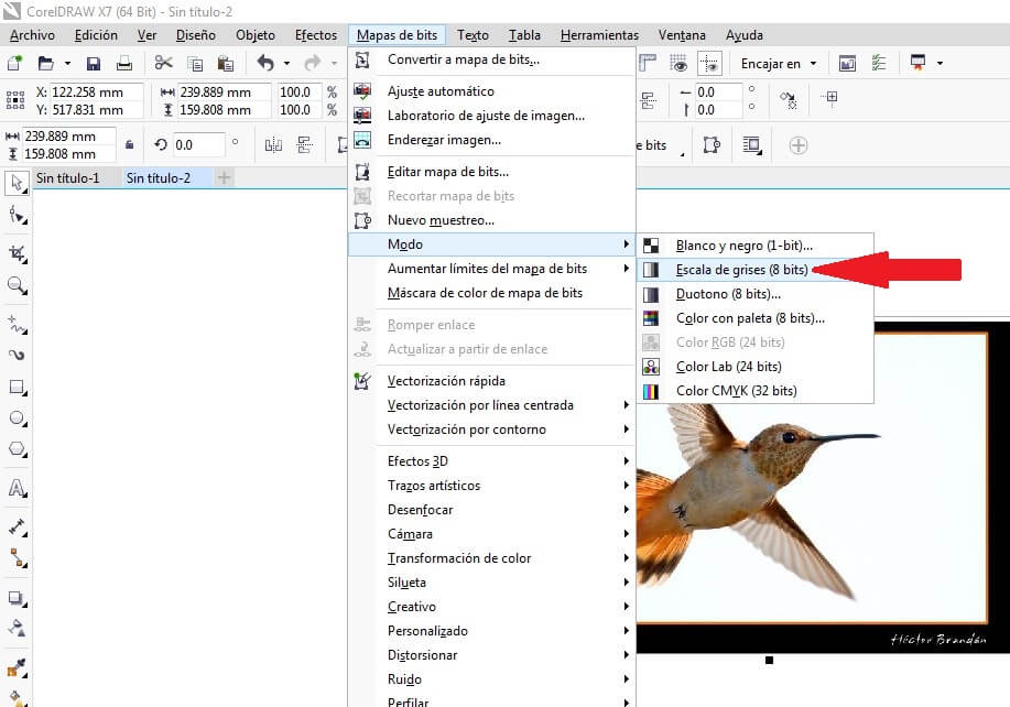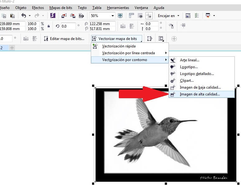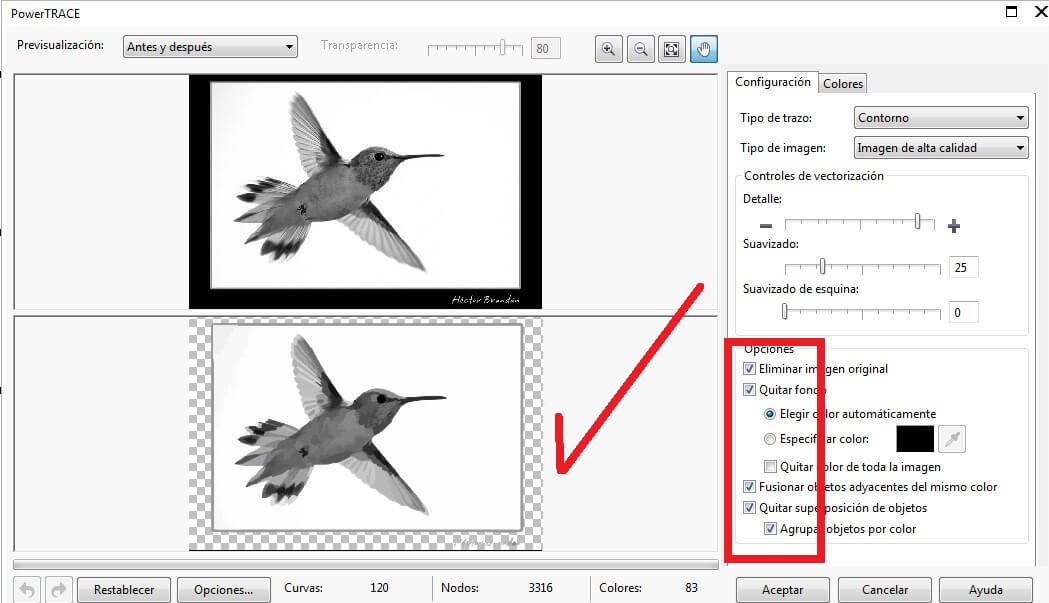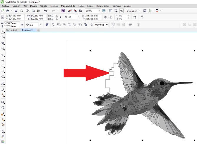 Open the toolbar Bitmap and choose the Mode command and pick grayscales (8 bits). Then use the command contour vectorization and chose High quality image. Verify the configuration and remove the background from the bird's picture, as I show below
