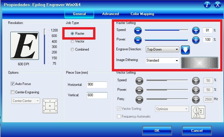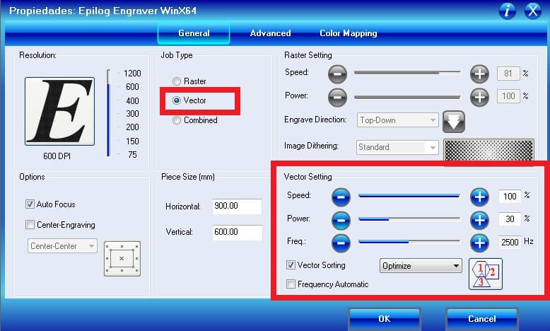 Configure the vectorization parameters: speed 100%, power 30% and frequency 2500 hz. I made the vector on 3mm MDF.