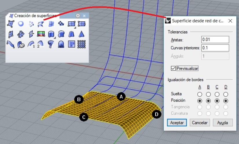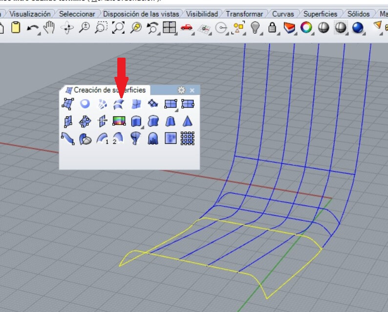 After that I selected the command Surface from 2, 3 or 4 edges and press enter. I chose previous as the mesh shows.