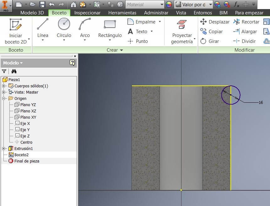 After that I pressed F7 to see the imaginary cut. I made a Geometric projection on the line and draw a 16 mm circumference