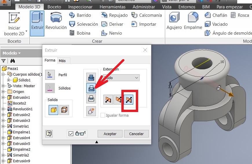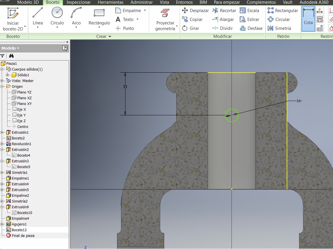 Press F7 to see the imaginary cut and draw a 10 mm circumference. Extrude it using the cut option.