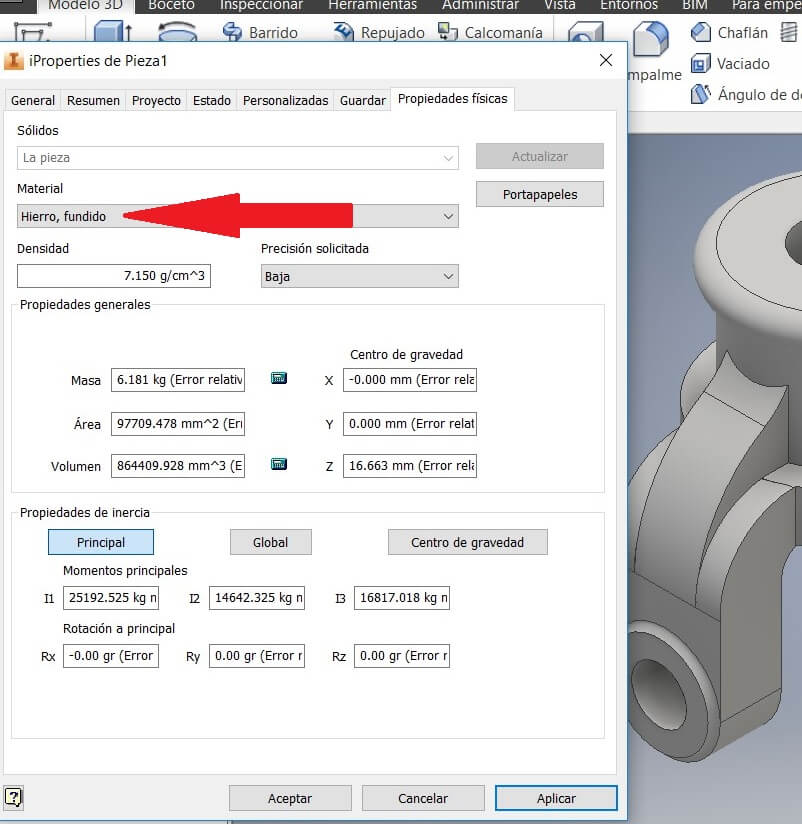 To apply the material features, go to Properties, physical properties, and use the iron. Remember that the software uses a color for every materia.