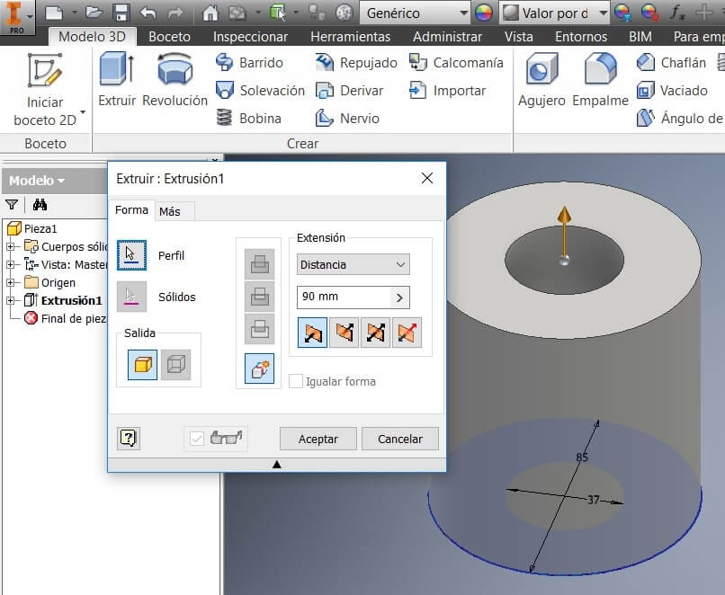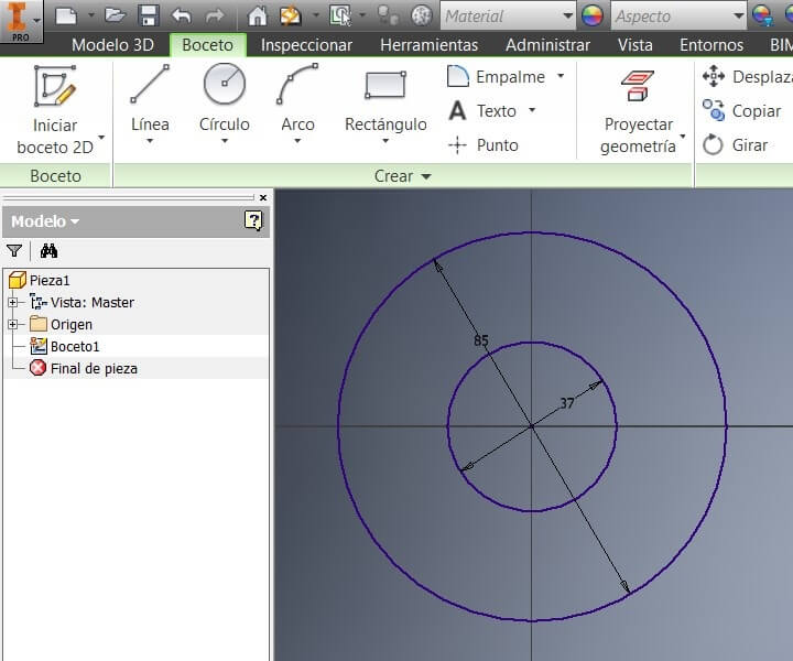 Pick a plane on the software. Then draw the sketch, in this case made of 2 circles, of 37 and 85 mm