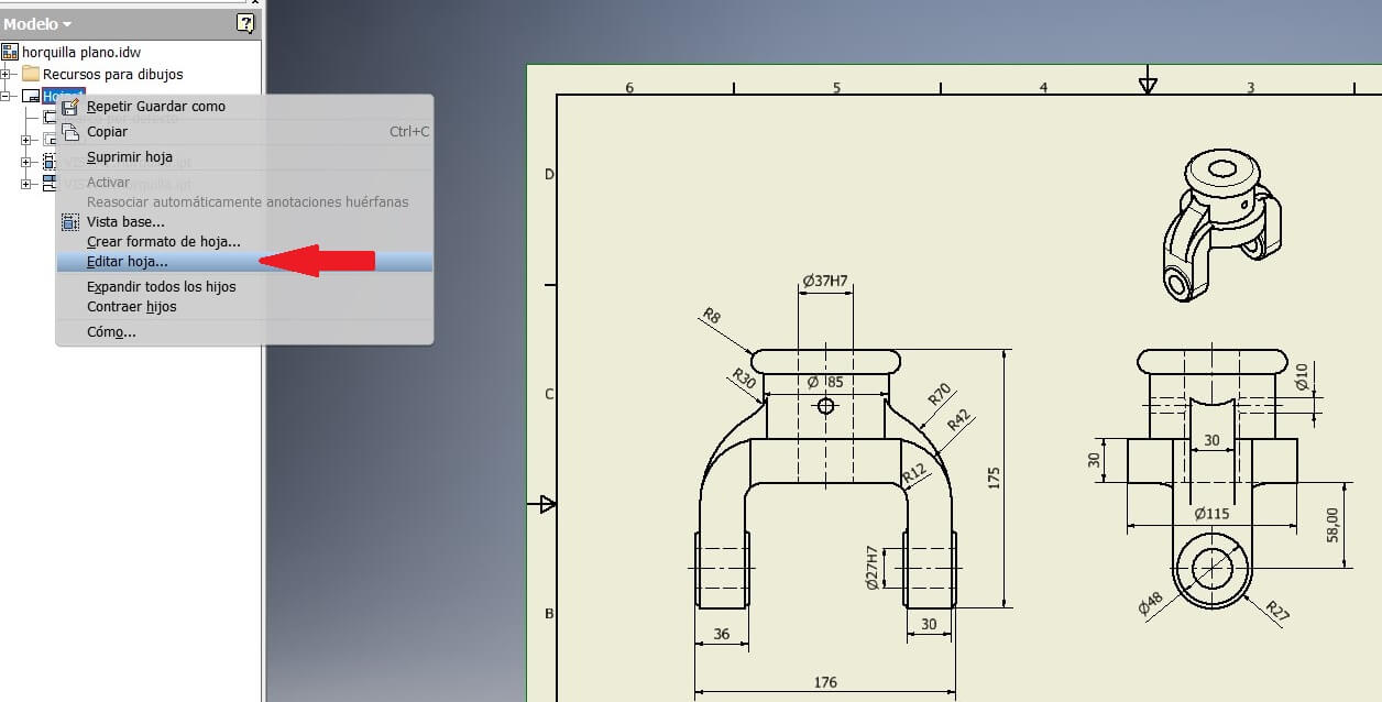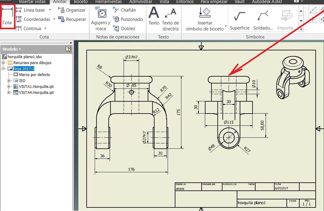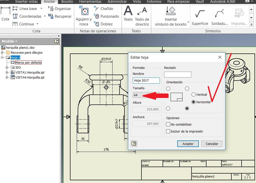 I chose the A4 and a horizontal position to add the views I needed. Then using the toolbar Limits I showed the measures.