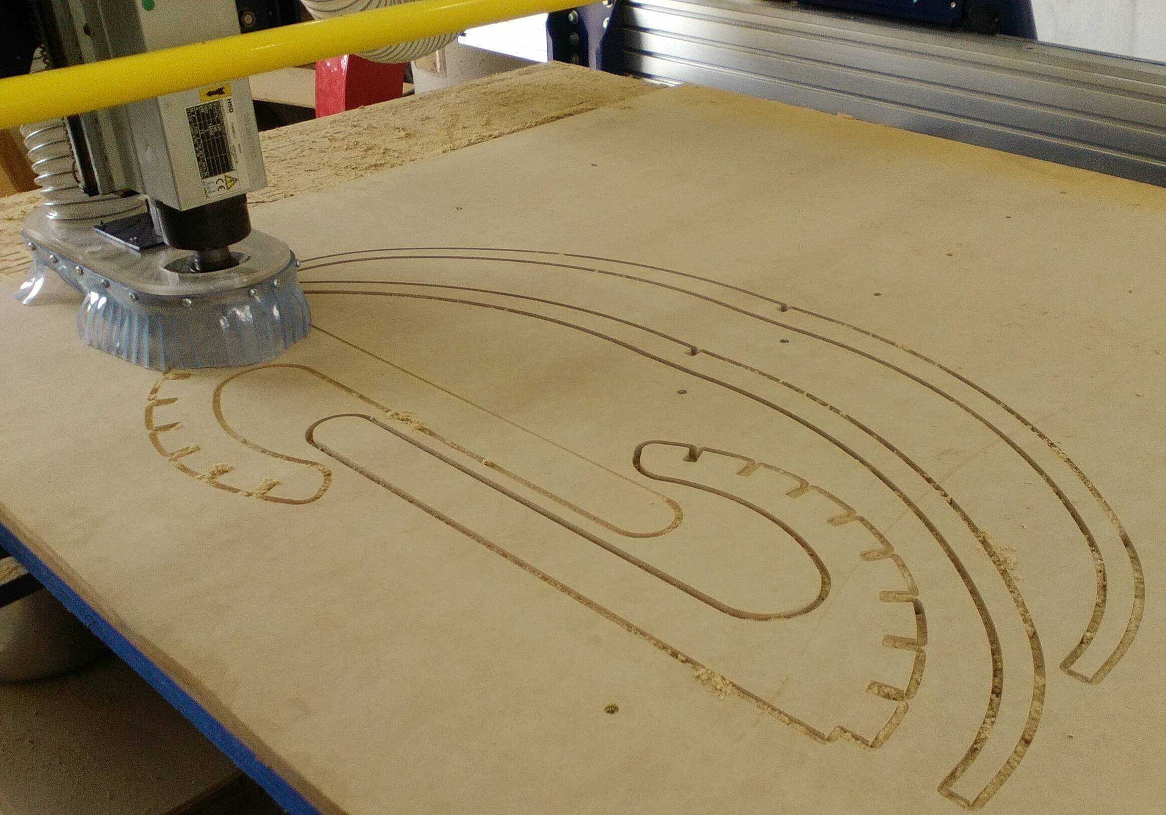 17 Then the 12 mm thick MDF began to be machined with a 2-mm helicoidal tip mill with the diameter 1/4 "mm. The feed rate was selected 100 m / sec at a speed of 8000 rpm. I immediately turned on the vacuum cleaner.