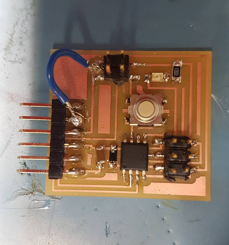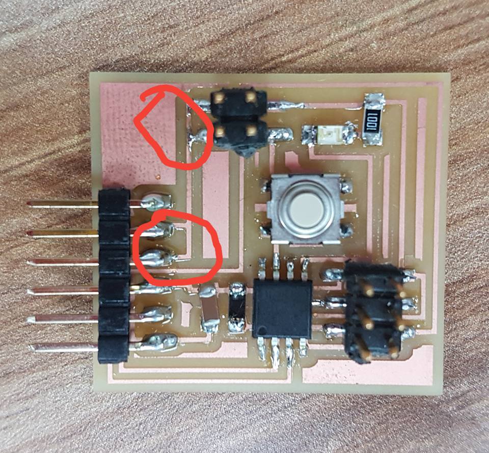 After milling the board and soldering all the components. I noticed that I connected the Rx and Tx together by mistake. I told Francicsco about it and he told me that it is a common mistake when using kokopelli so I fixed this problem by cutting the thraces and adding a wire.