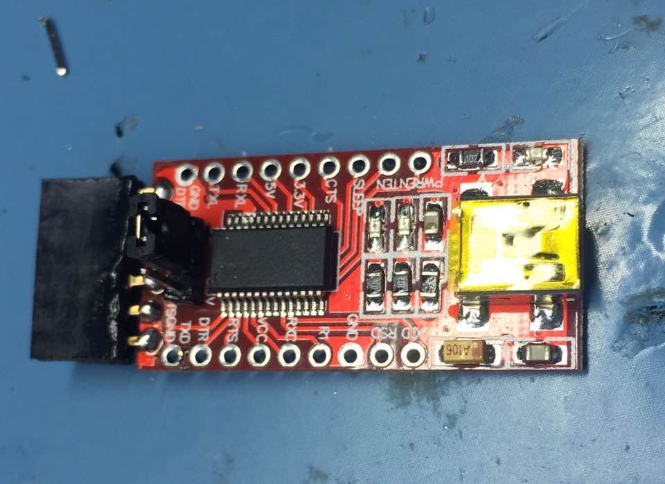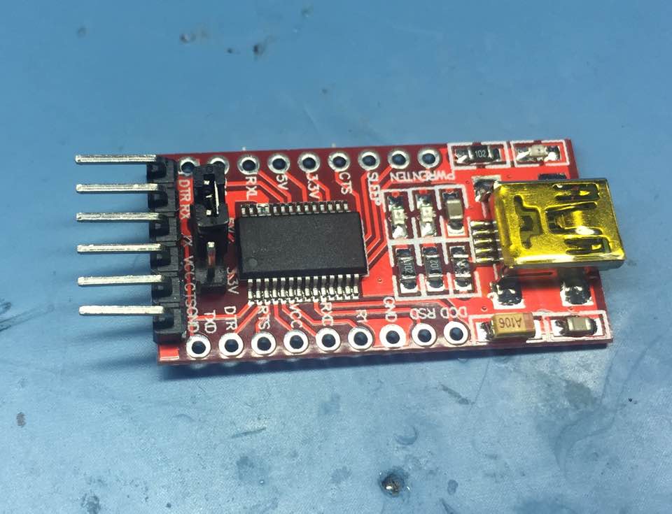 The only modification I made to the FTDI board is changing the pins from male to female pins