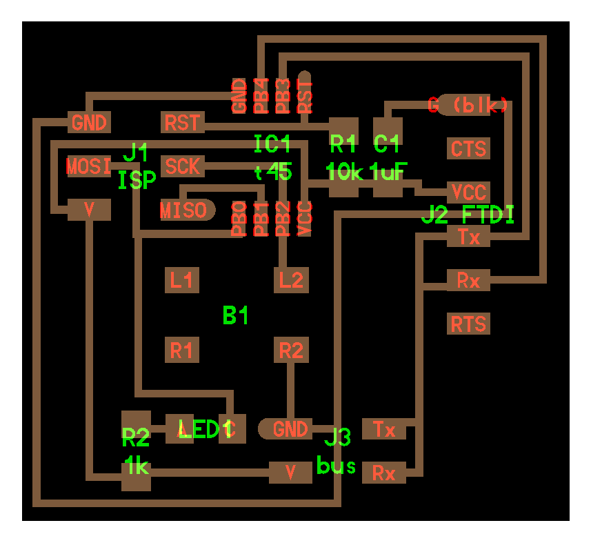 Then, I modified it using kokopelli. What I did is I added (Rx, Tx, GND, VCC) pins to make serial communications between it and the other board I'm going to choose. Also, I added an LED to be controlled by the other board and also it will help me to debug it later when I'm going to program it for the output devices assigment. Here is the modified board: