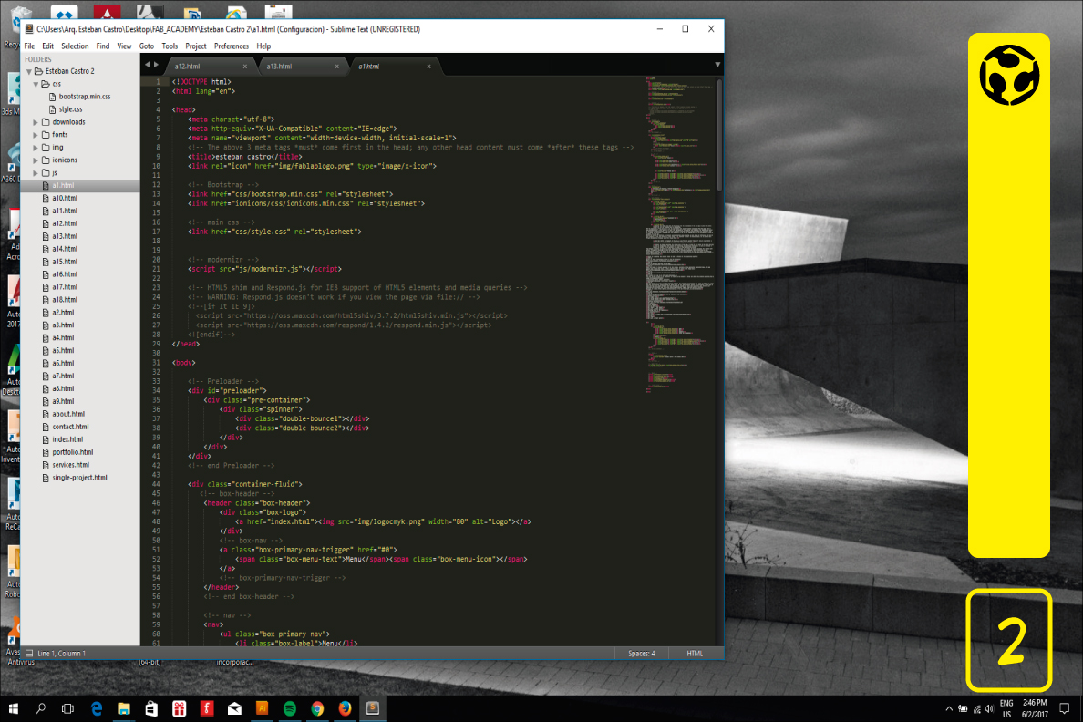 2. To edit all the configuration of the web design template use a software called sublime I modify the html files (Hyper Text Markup Language), that contains the main code what says to the navigator how display the images and text using colors, fonts and page sections. I also needed edit the css file (Cascading Style Sheets) for to make small changes like colors, text align and fonts.