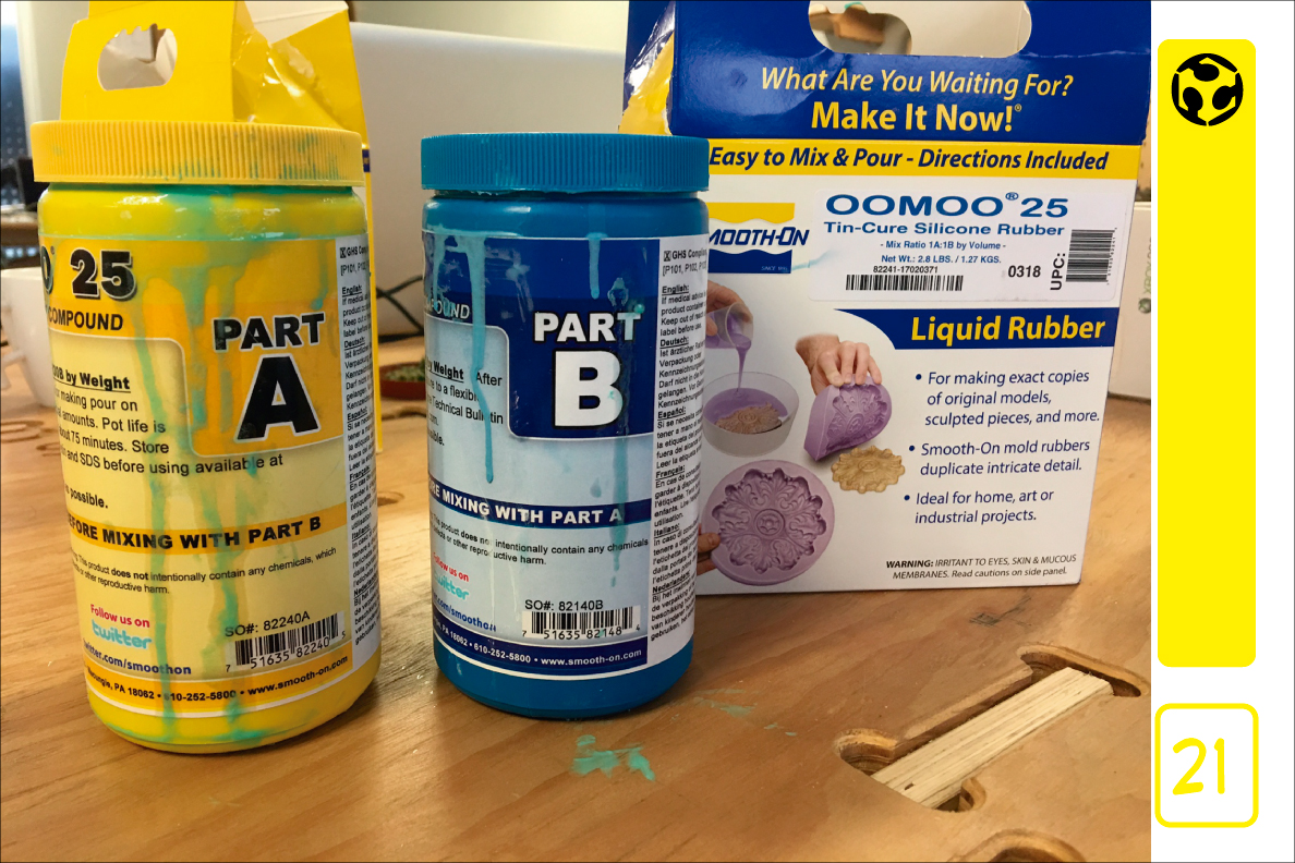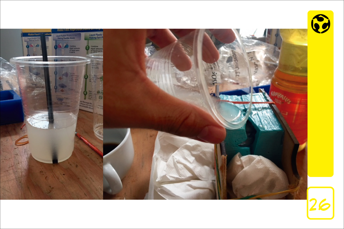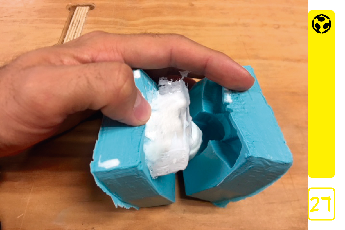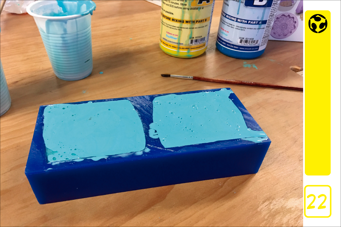 21. For the rubber mould we prepared the mix with equal parts of the compound. We used vegetal oil as release agent, and applied it with a brush to the wax.