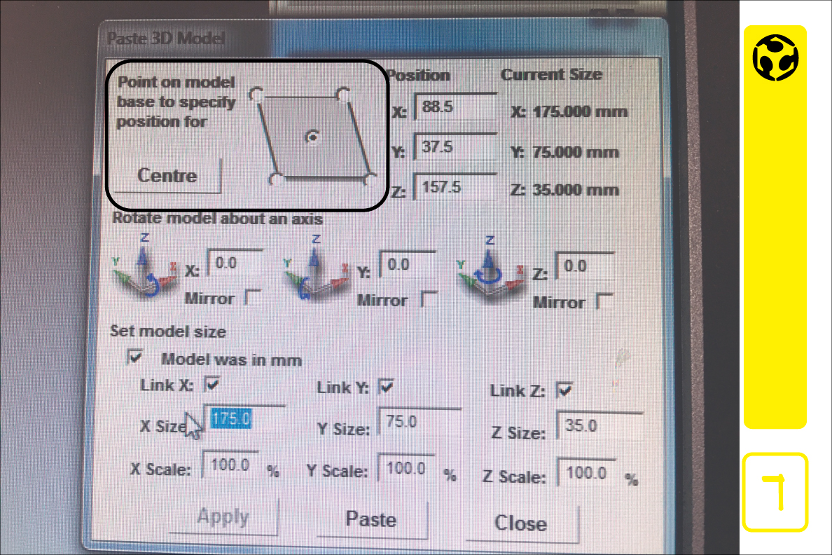 7. We set the position of the x, y, z axes in the model and verify the size.