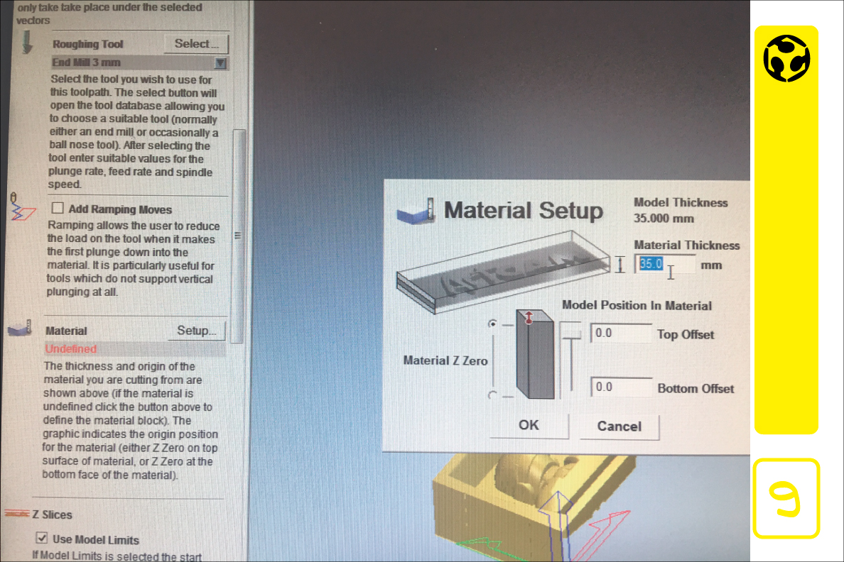 9. Set the parameters of the material, the thickness: 35.0mm, position on top.