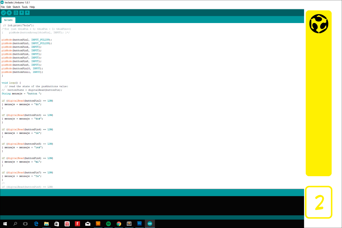 In relation to my project, use the code to configure the musical notes, within the configuration of the code, the notes should be displayed in a graphical interface, and that is where I use a software called Processing, which allows me to display that information of each Musical note in its graphical interface and every time a button is pressed it shows me which note I am selecting at the moment, if it is one or several notes at a time.