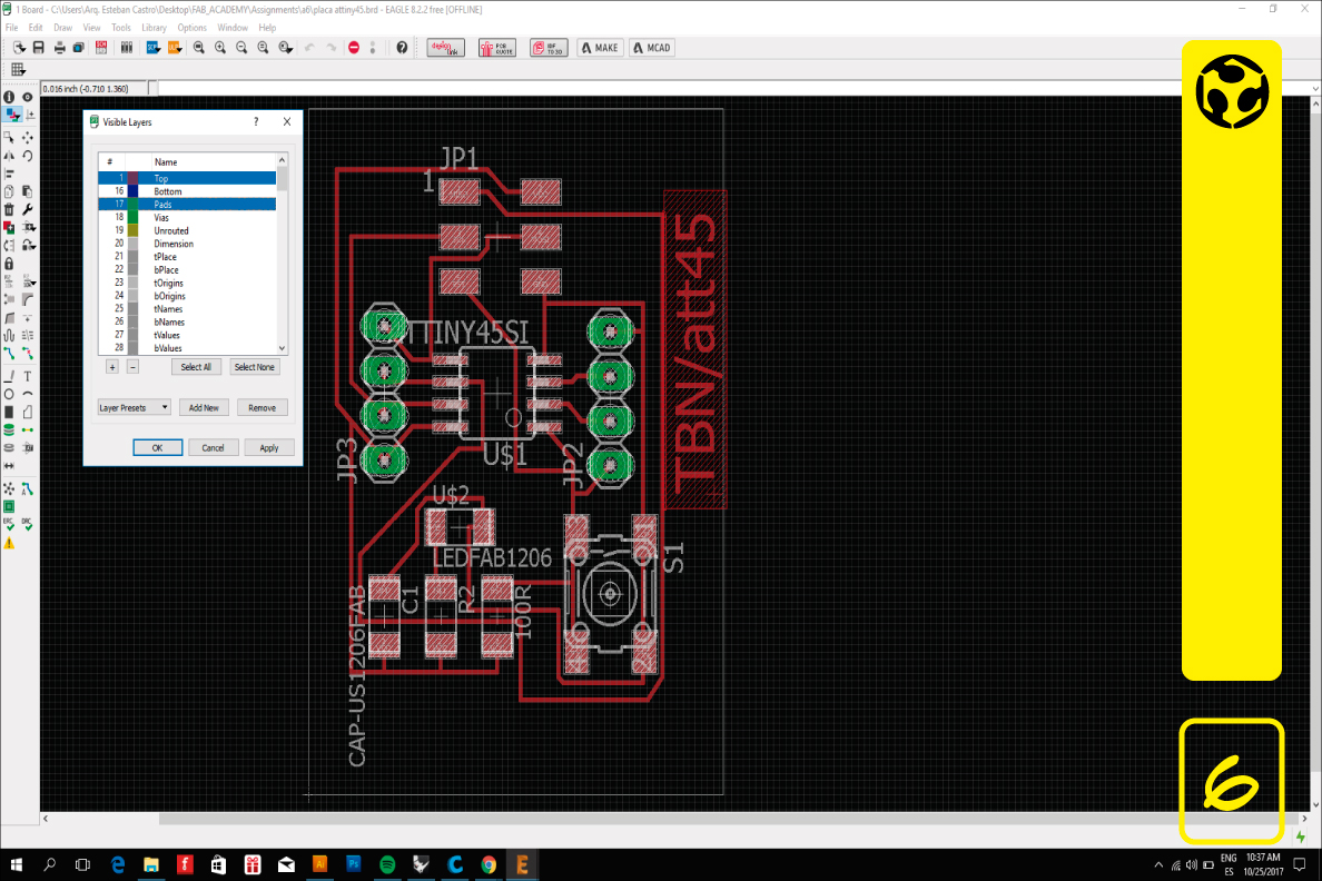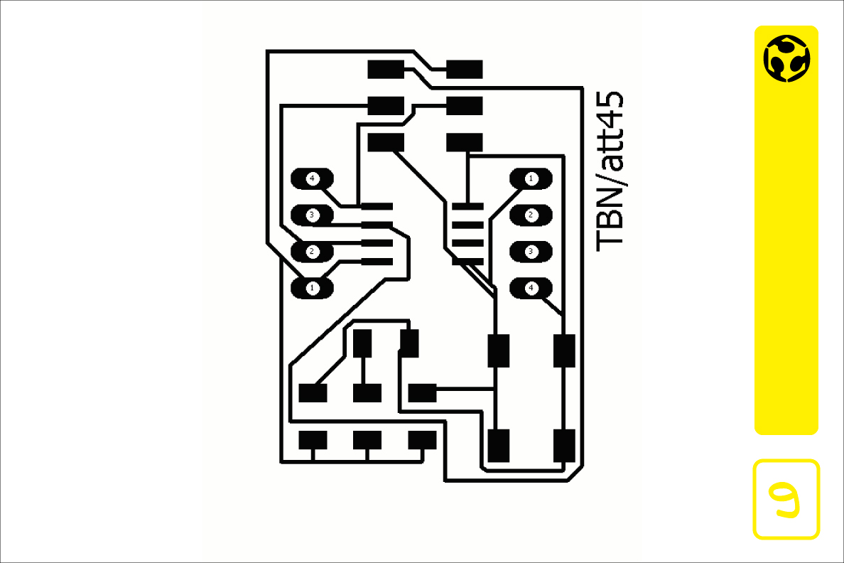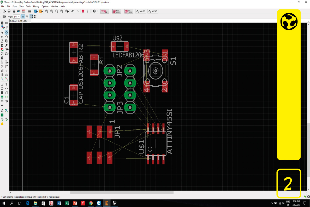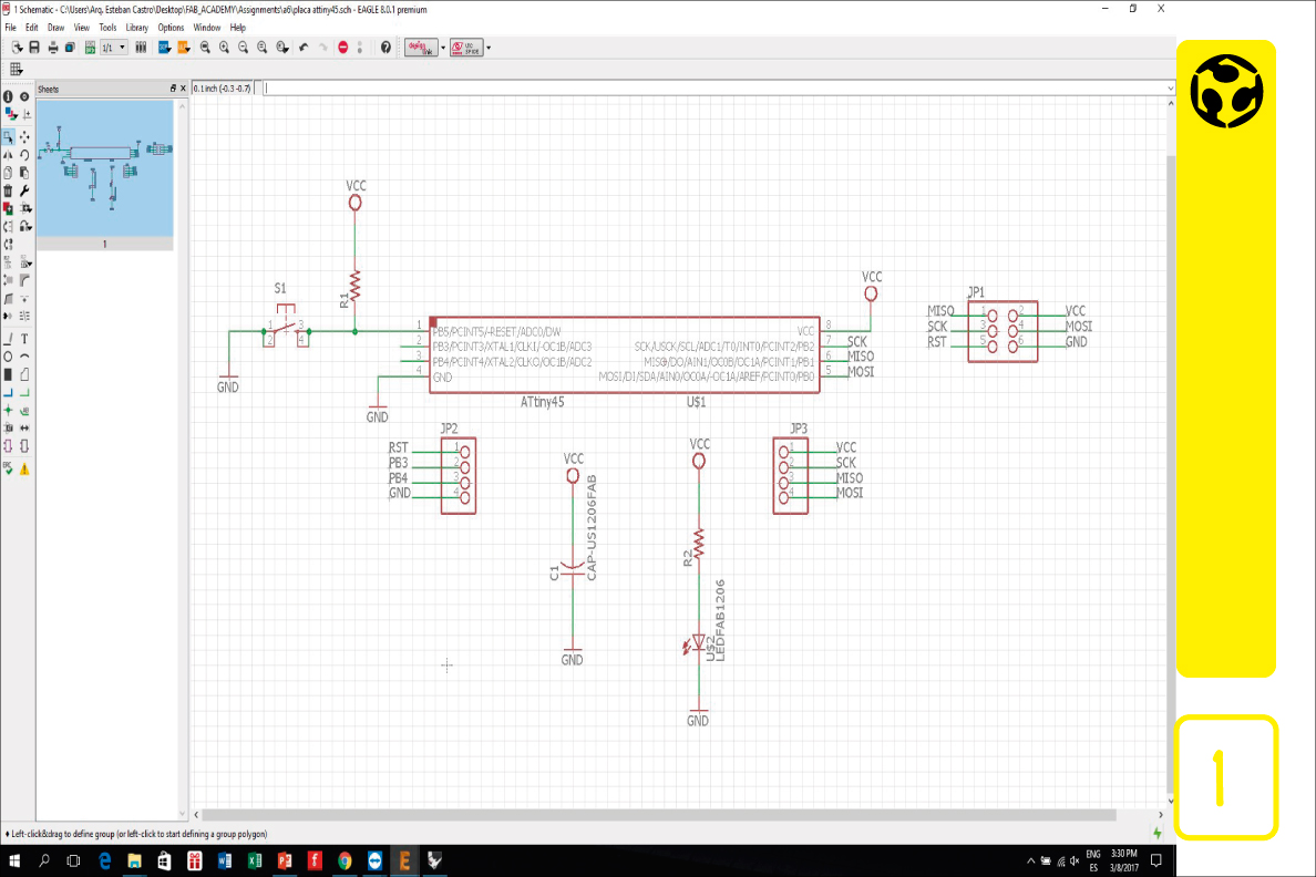 1. We started drawing the schematic (eagle software) for the board, first the microcontroller, then other components and the pin headers for programming and connecting to a circuit. When we finishe the schematic, we added a button and an led to the board. Since we will need the free pins to use as input or outputs for later circuits, we decided to add the led as a power indicator, and the button as a reset switch.
