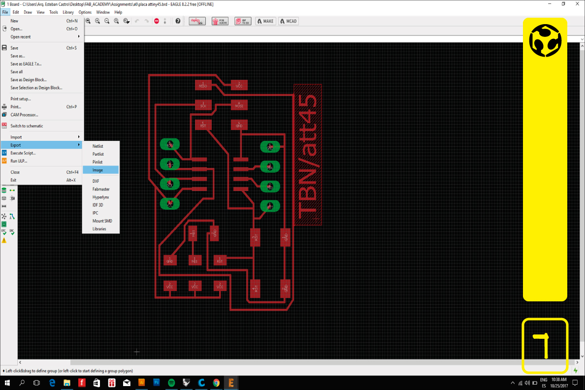 The assignment for this week consisted of redraw the echo hello-world board, add (at least) a button and LED (with current-limiting resistor) check the design rules, make it, and test it. Using the knowledge acquired previously, we made the design of the board which contained a button and a led, after downloading the software and libraries, we can approve it and run a test with Arduino and check its implementation.