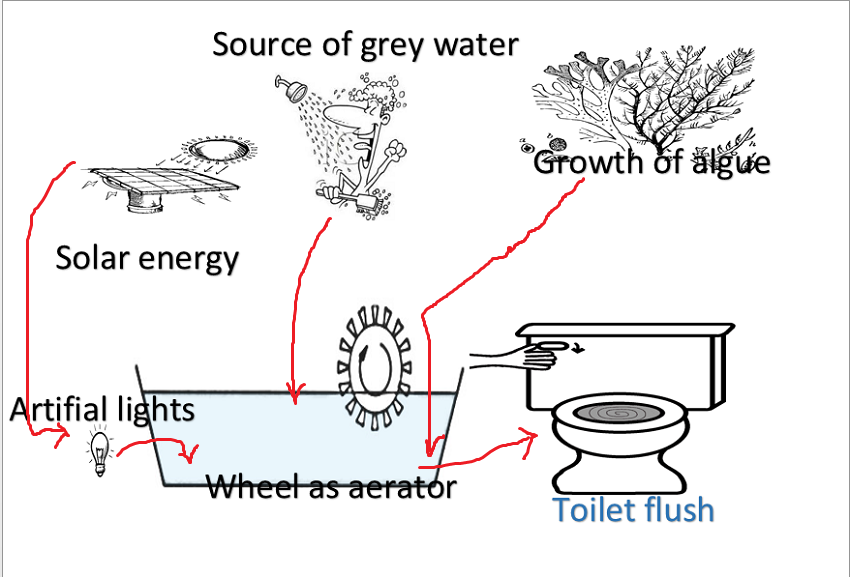 ii) System to grow plants by providing light at the bottom of grey water tank.When small plants like algue grows in that water, it helps to increase the oxygen level inside the grey water. This will work by using solar panel and LED lights.