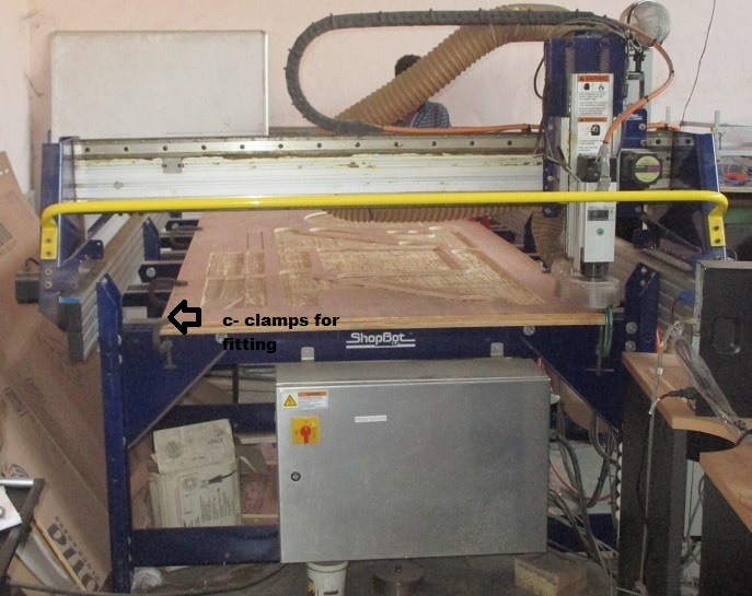 After finishing all tasks i.e. making of toolpath start machine. Start motors and exhaust too. Move router manually. Set origin and make G-code. After this detailed procedure start cutting. In this cutting I was using 0.11 inches depth of cut and feed rate as 0.7 inches/sec also 14000RPM for my cutting files. The Shop bot machine at COEP is a 2.5 axis machine which is able to tool wood and and plywood, it has guide ways for X and Y axis, at the z axis is a router which is capable to spin at 18000 RPM It has a vaccum pump to such all the debris created by the tooling of the wood. It runs on 230V Ac supply, and can has a standard 8'*4' bed size.