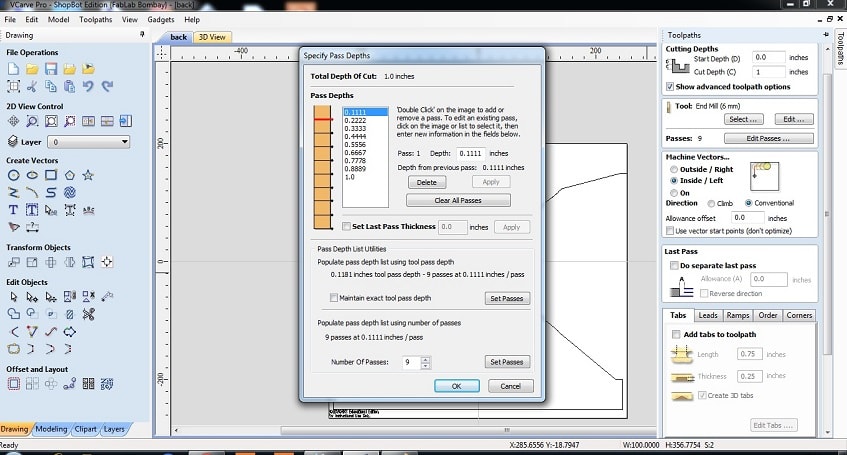 Then go through edit option and select pass depth of the tool. Then select end mill.
