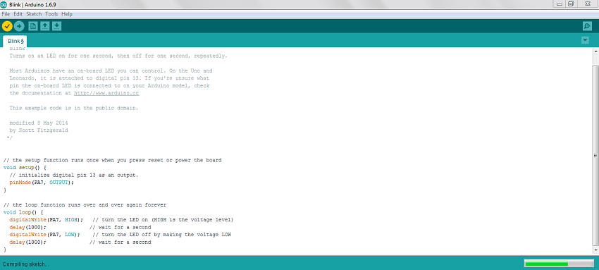 . In this case the code is to blink make the pin no PA7 high and give it a delay of 1000 ms