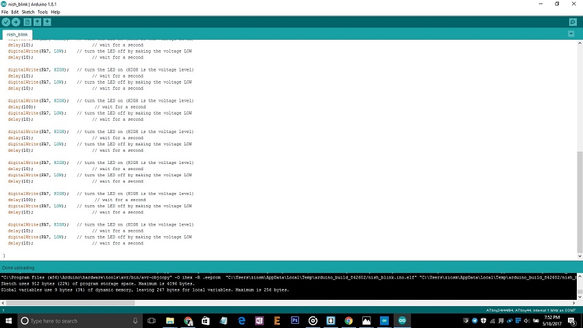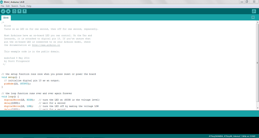 Then move towards the hello program....Go through example - basic - blink program. Connect programming pins like MISO,MOSI,SCK,RESET,VCC and GND by using ardiuno ISP program