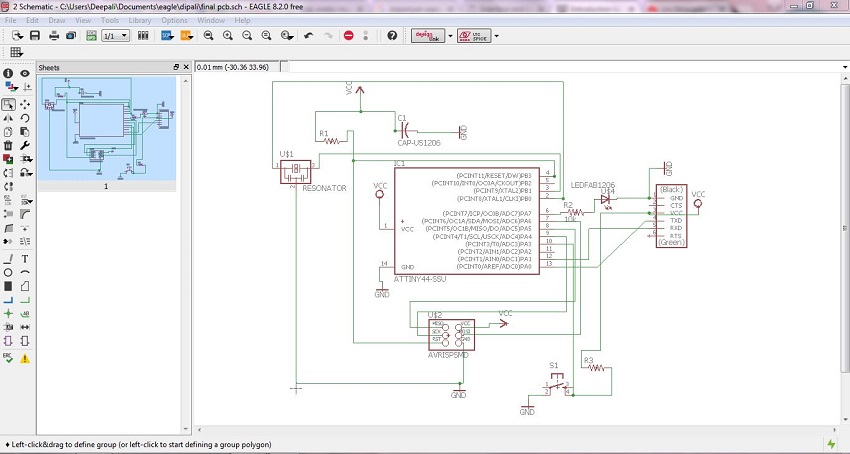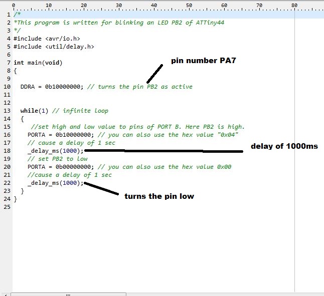 We are using Attiny44 as a microcontroller on our hello board, which uses a Harvard Architecture which excutes a instructions in a single clock cycle. I learn how to read data sheet.It includes details of attiny pines and also brief introduction of every pins and there existences.It was helping me in output and input assignment.
