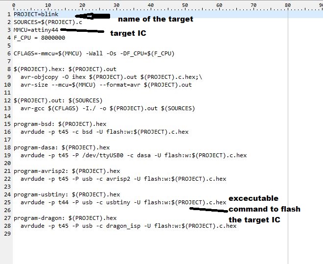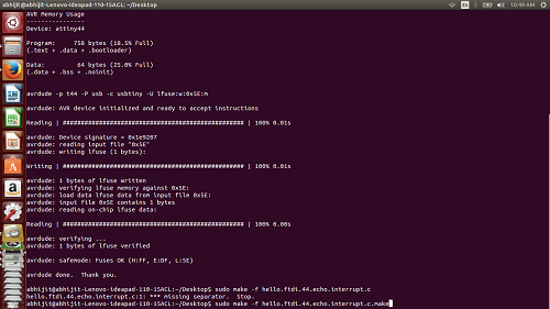 Commands for burn the code into the IC, 1) make-f blink -This created the hex and out file in the same folder.The hex file contains commands in hexadecimal language which can be interpreted by the IC When we give flash command it is this file which is burned in the IC. Then target that hex file in the command "sudo acrdude -p t44 usb -c usbtiny -U flash:w:blink.c.hex".