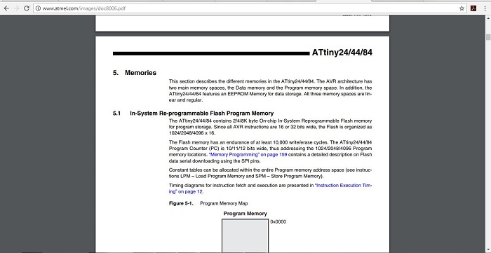 There are 3 types of memories in ATTiny 44 as, Data memory space and program memory space, in addition it has EEPROM memory space for storage. I realised that all the doubts you have about a component will be cleared if you go through the datasheet.